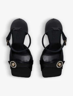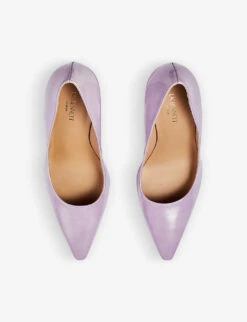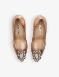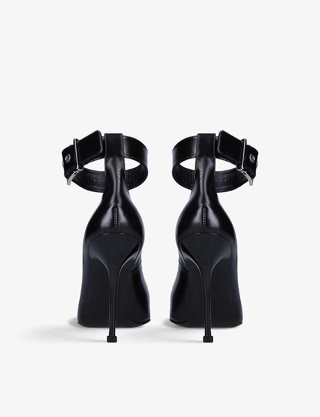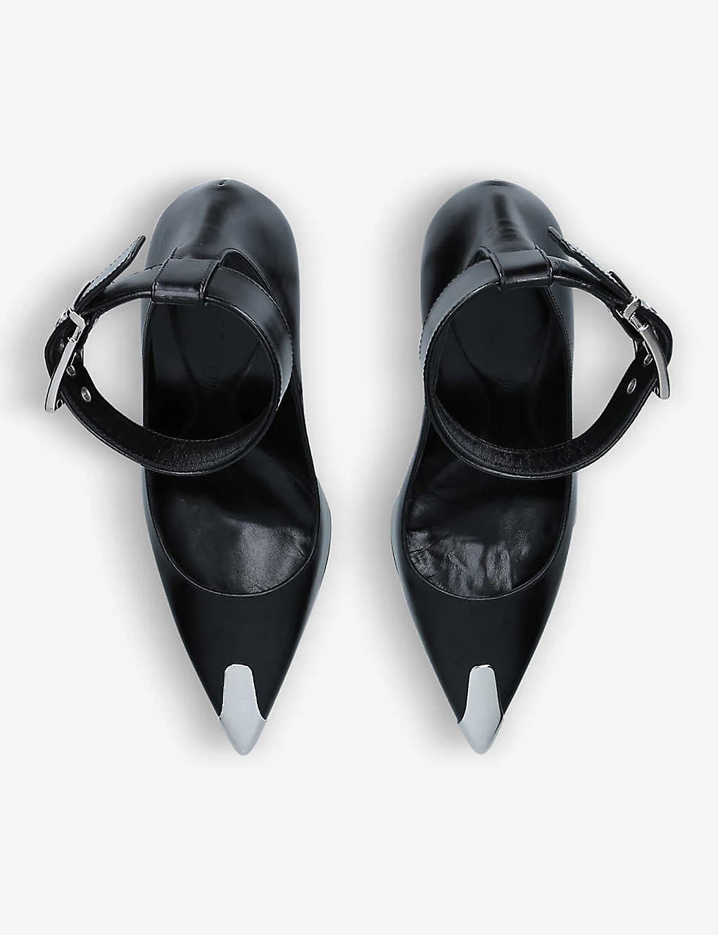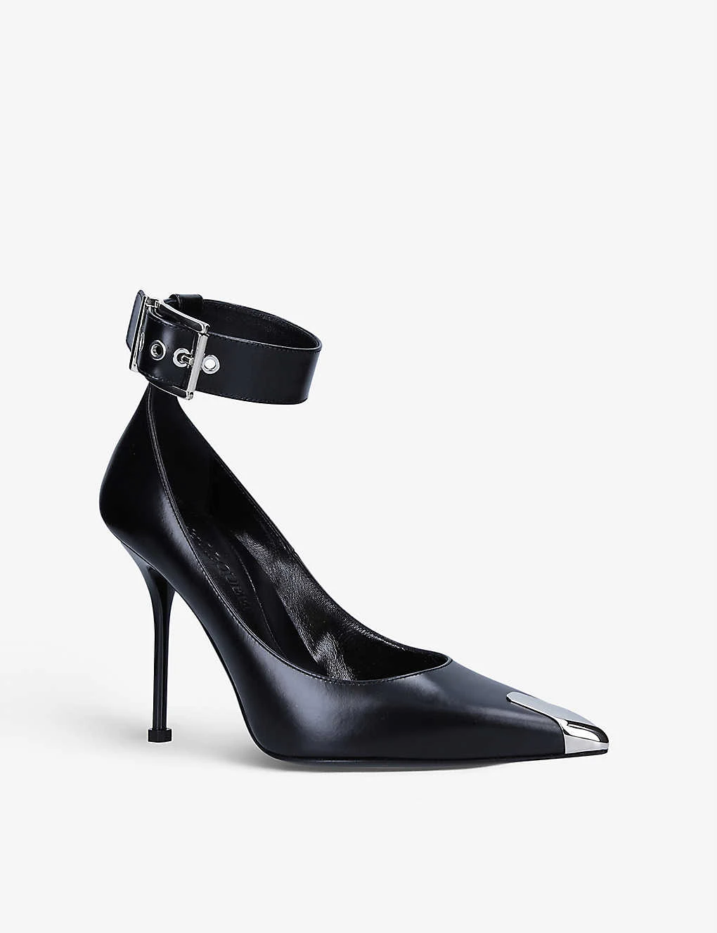 - Pointed toe, metal toe cap, strap around the ankle, stiletto heel, silver-tone hardware
