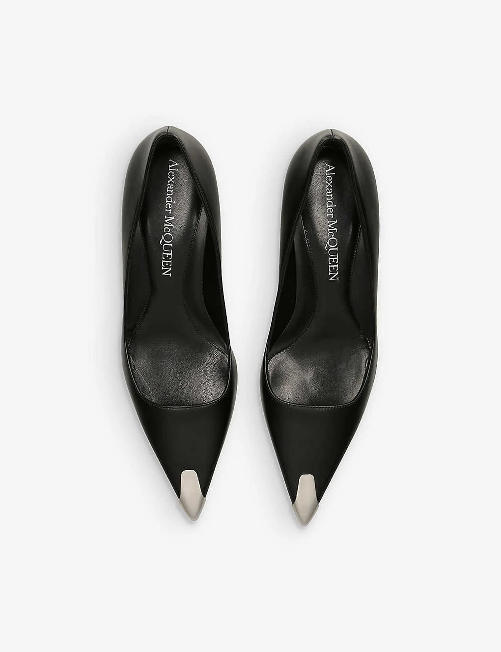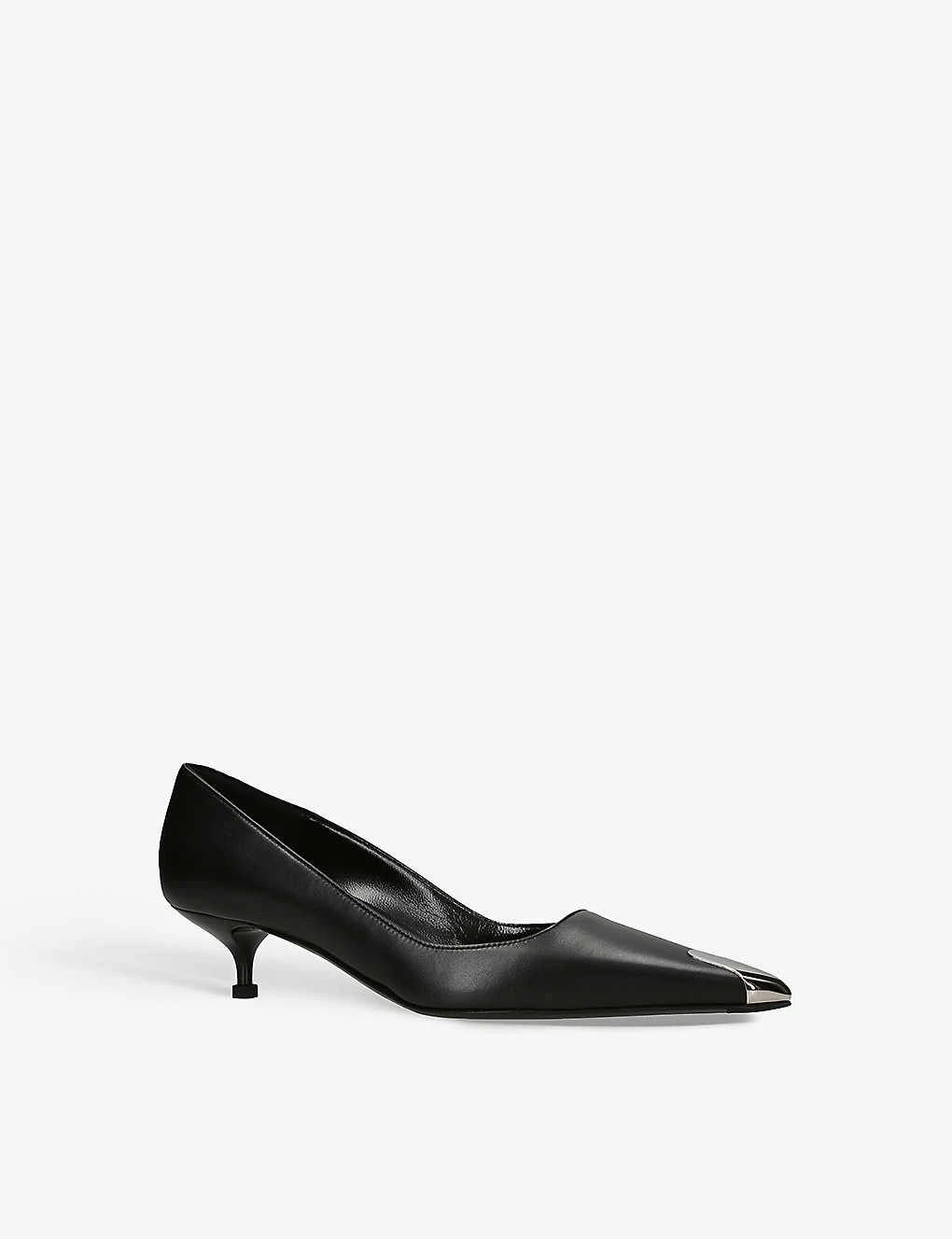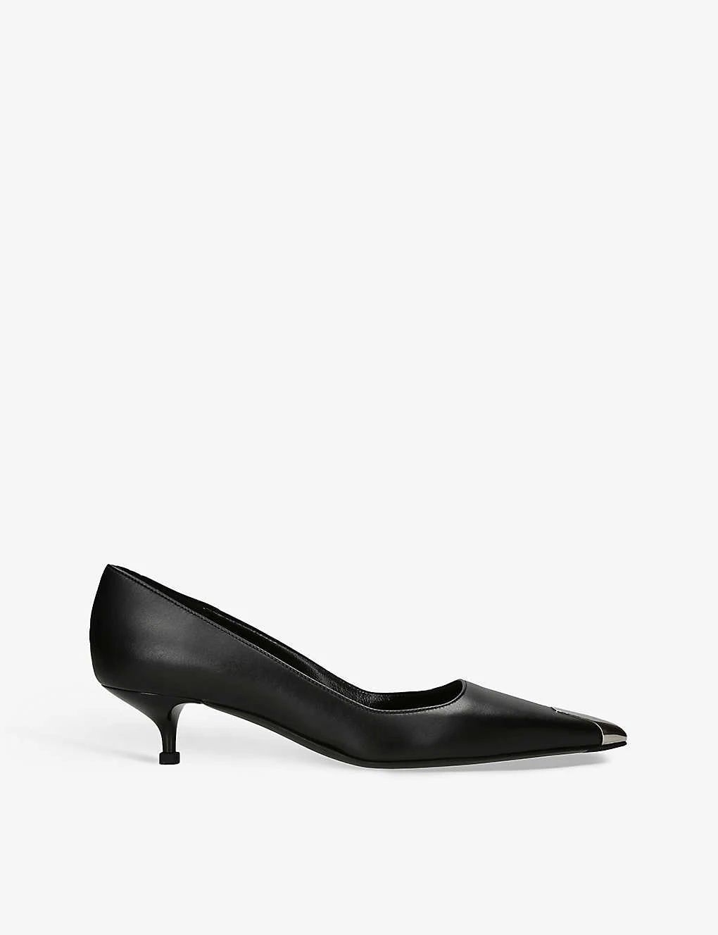 - Pointed toe, closed toe, silver-toned metal toe cap, kitten heel, smooth finish