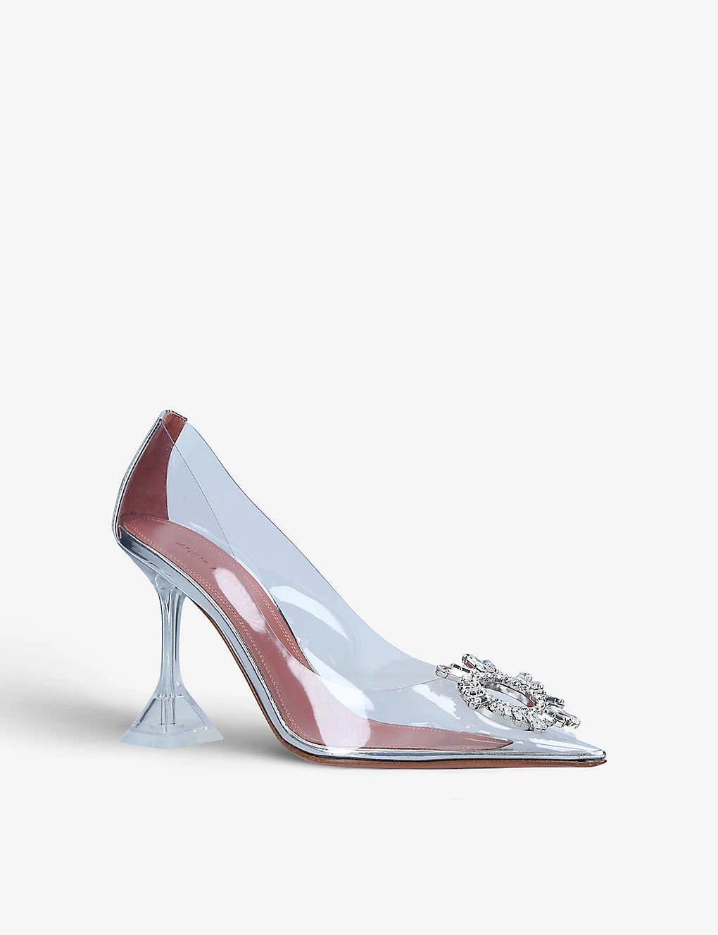 - Hourglass-shaped heel, pointed toe silver-toned hardware, embellished toe detail