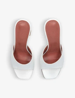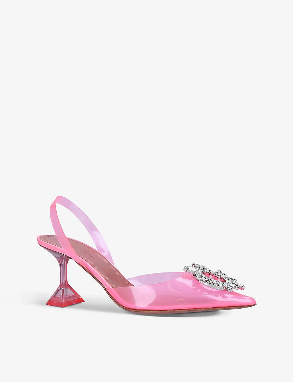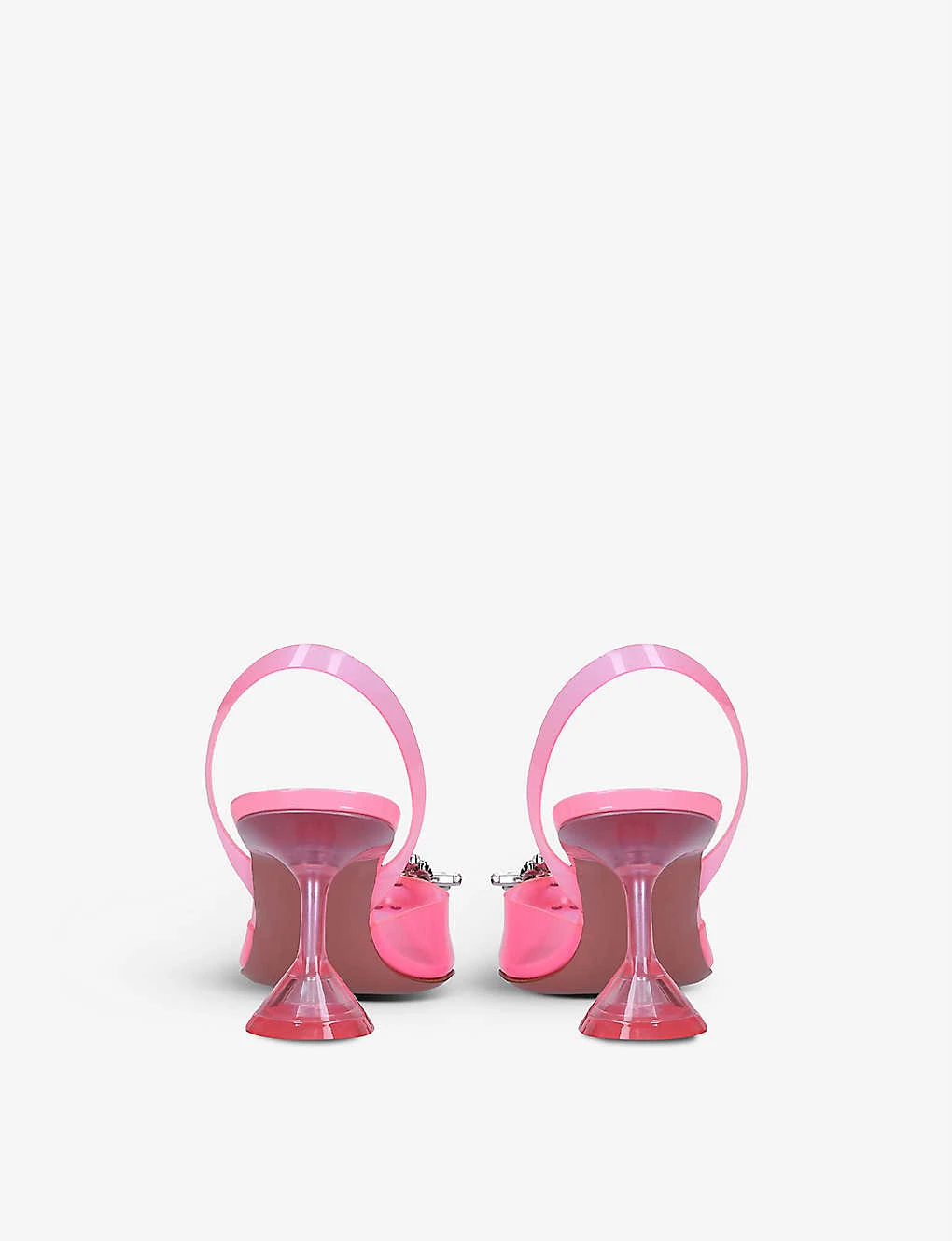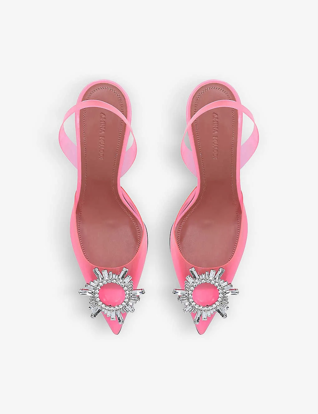 - Hourglass-shaped heel, pointed toe, open toe, silver-toned hardware, crystal-embellished brooch at front, logo-embossed at insole