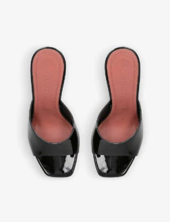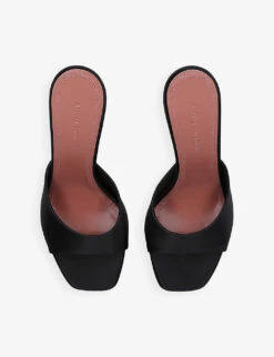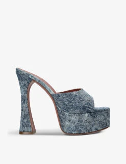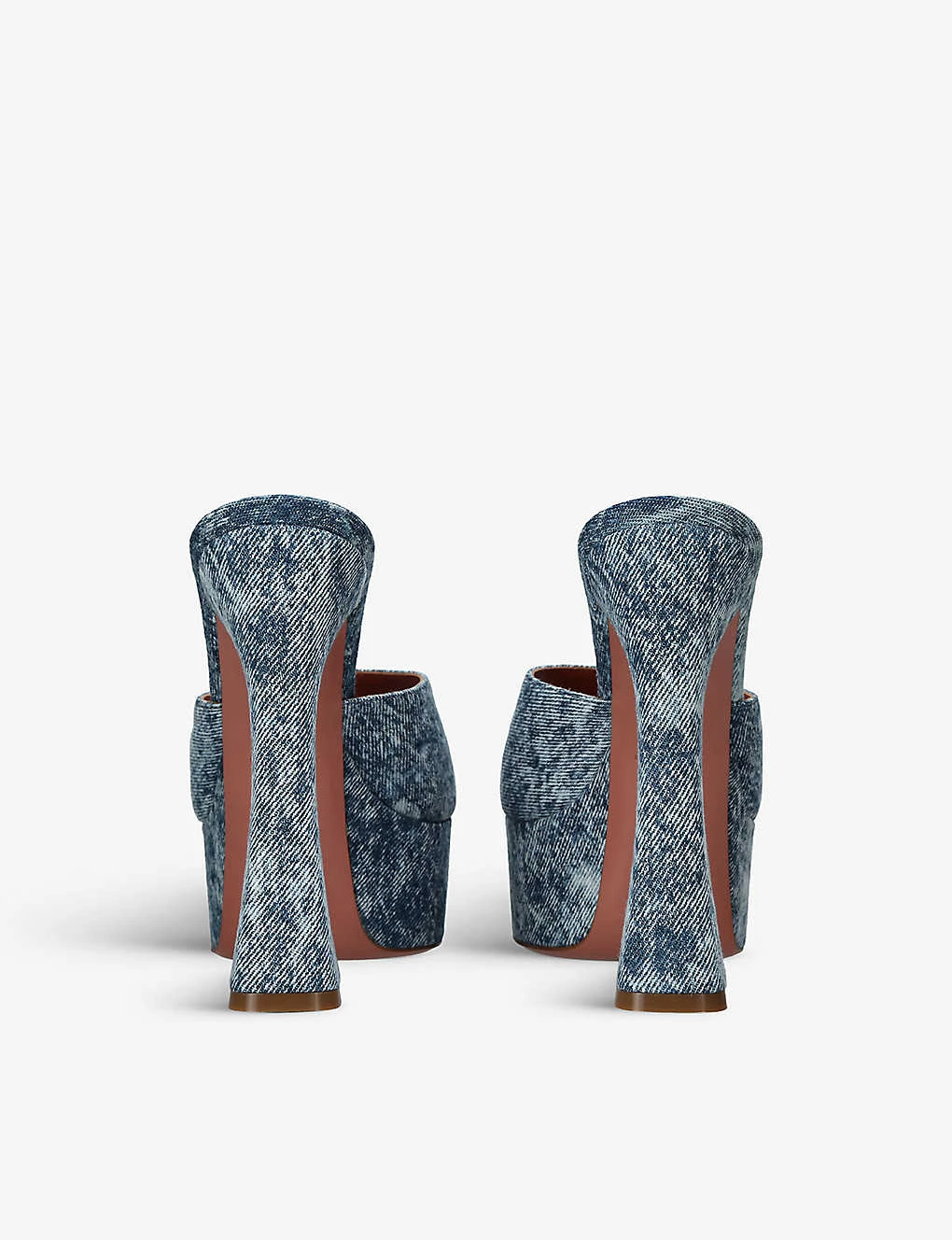 - Open toe, round toe, front strap, backless, high heel, platform sole, all-over denim acid wash