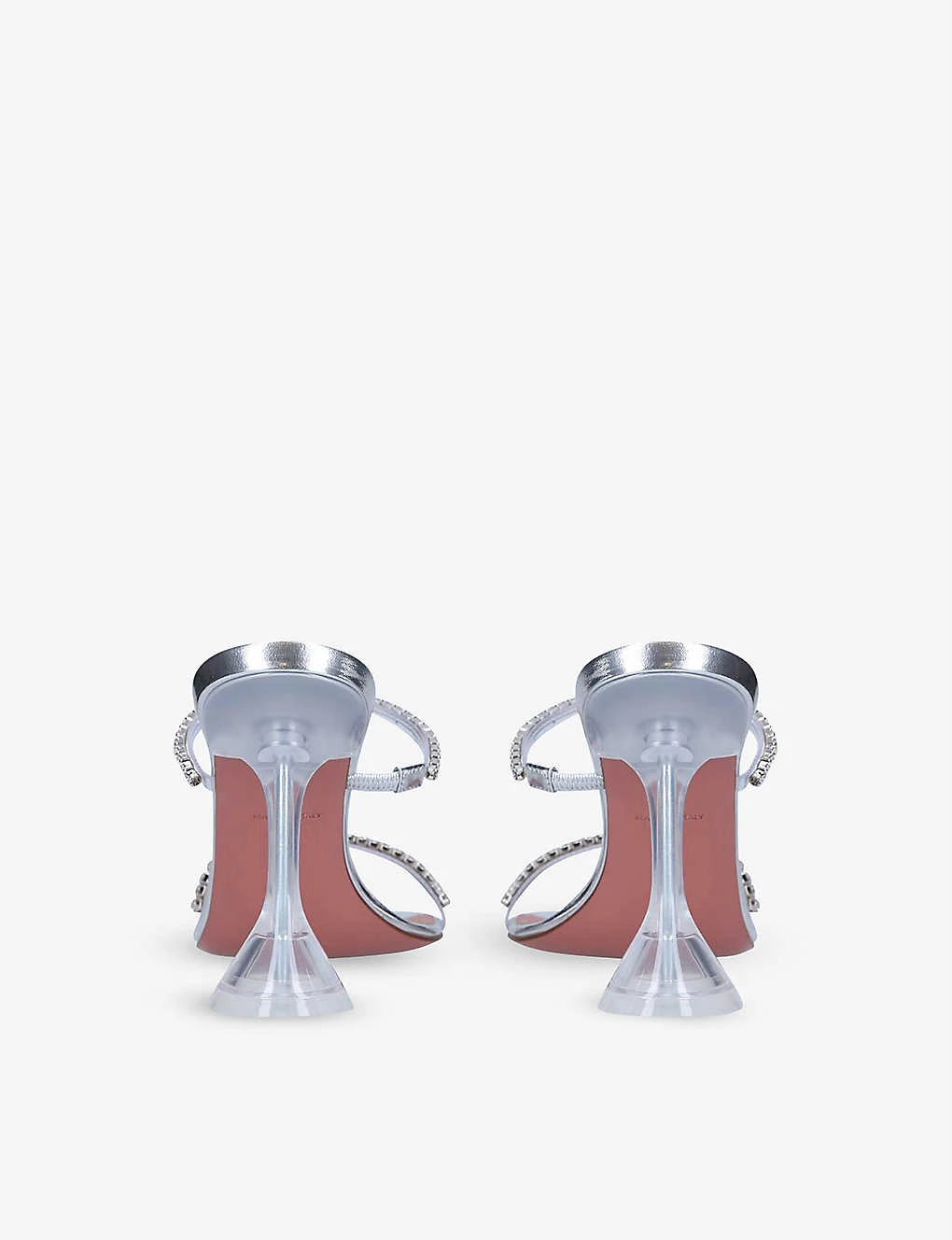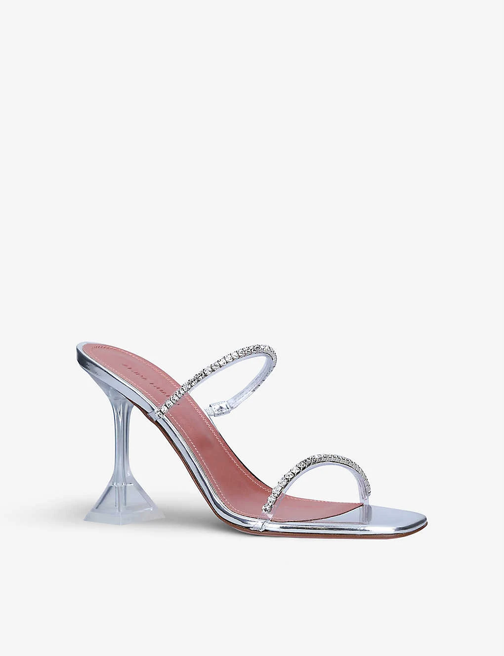 - open toe, signature hourglass-shaped heel, two crystal-embellished straps, all-over metallic effect