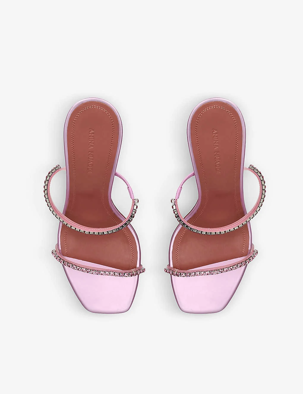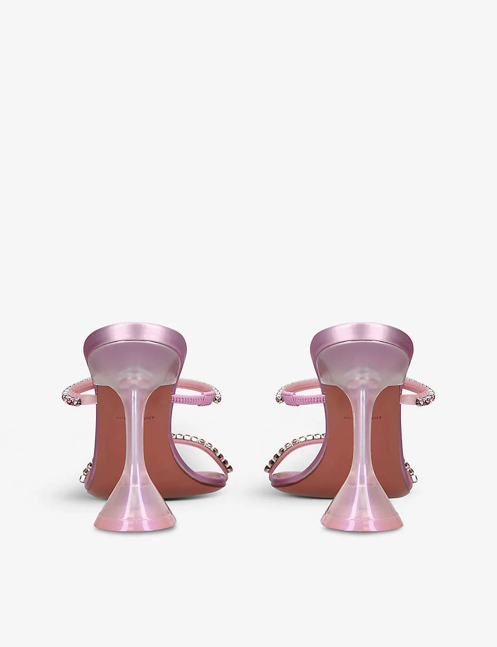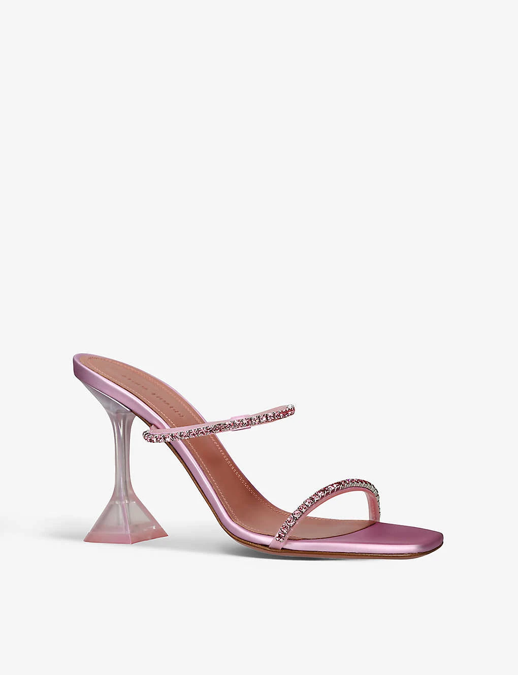 - Hourglass shaped heel, pointed toe silver-toned hardware, embellished straps