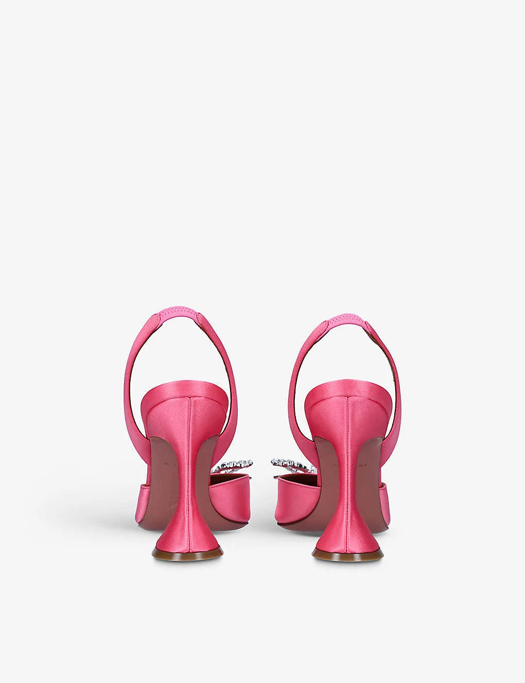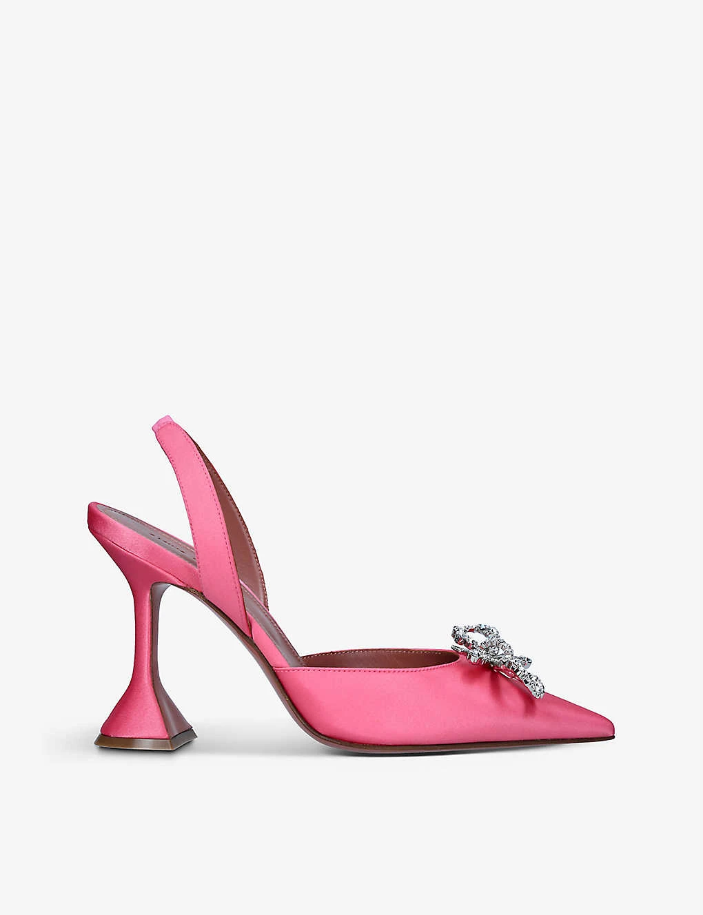 - Flared heel, sling back, pointed toe, silver-toned hardware, embellished toe detail