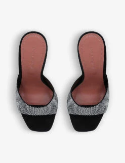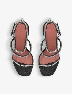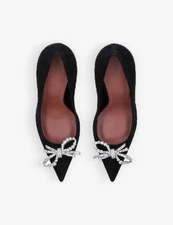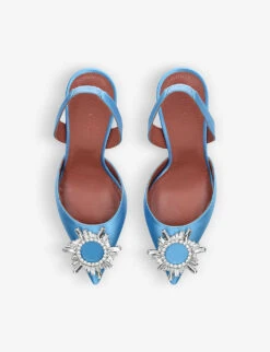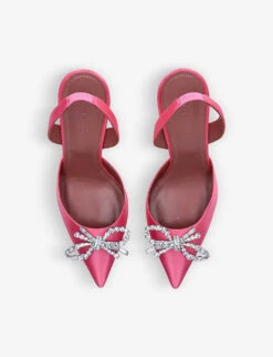 - Flared heel, sling back, pointed toe, silver-toned hardware, crystal-embellished bow
