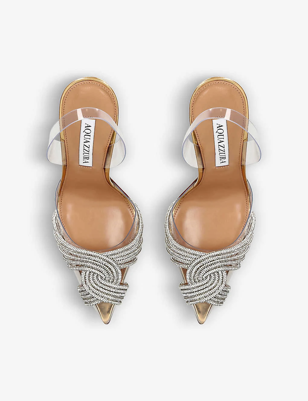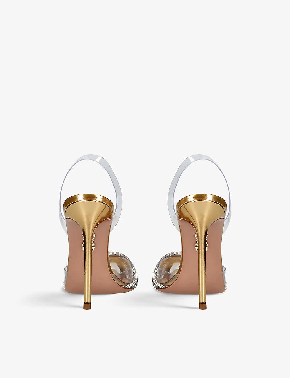 - Pointed toe, slingback strap, crystal embellishment on toe, covered stiletto heel, gold-toned pineapple branding on sole