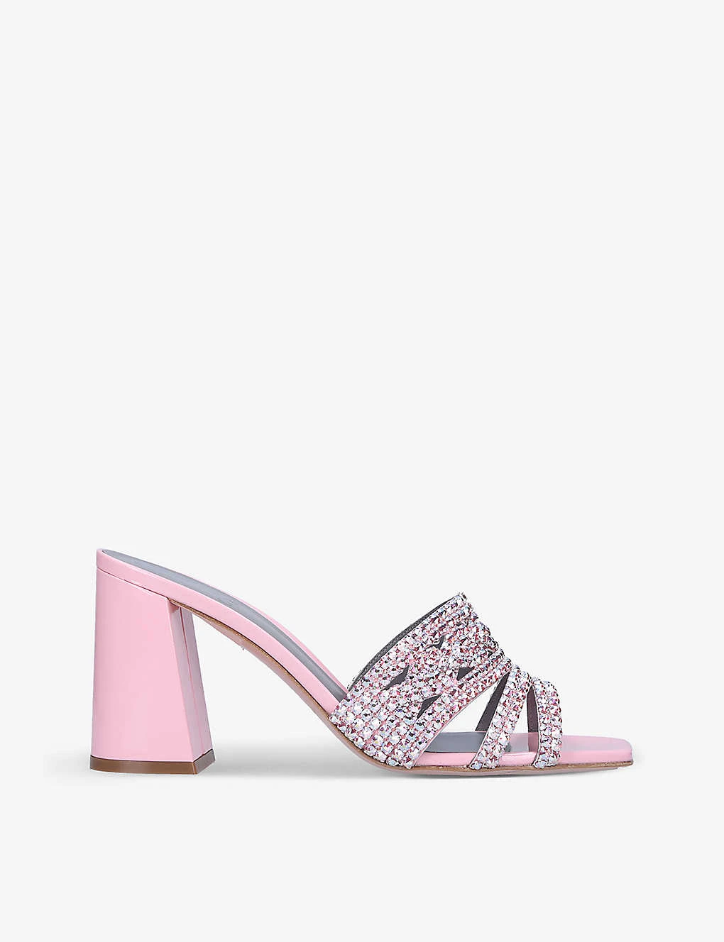 - Square toe, open toe, backless, block heel, Swarovski crystal-embellished straps, branded insole