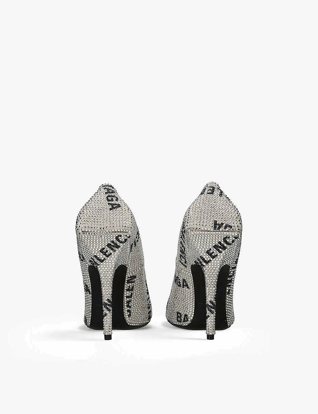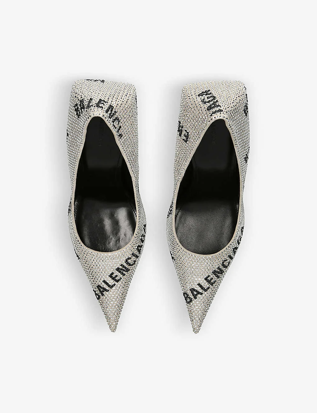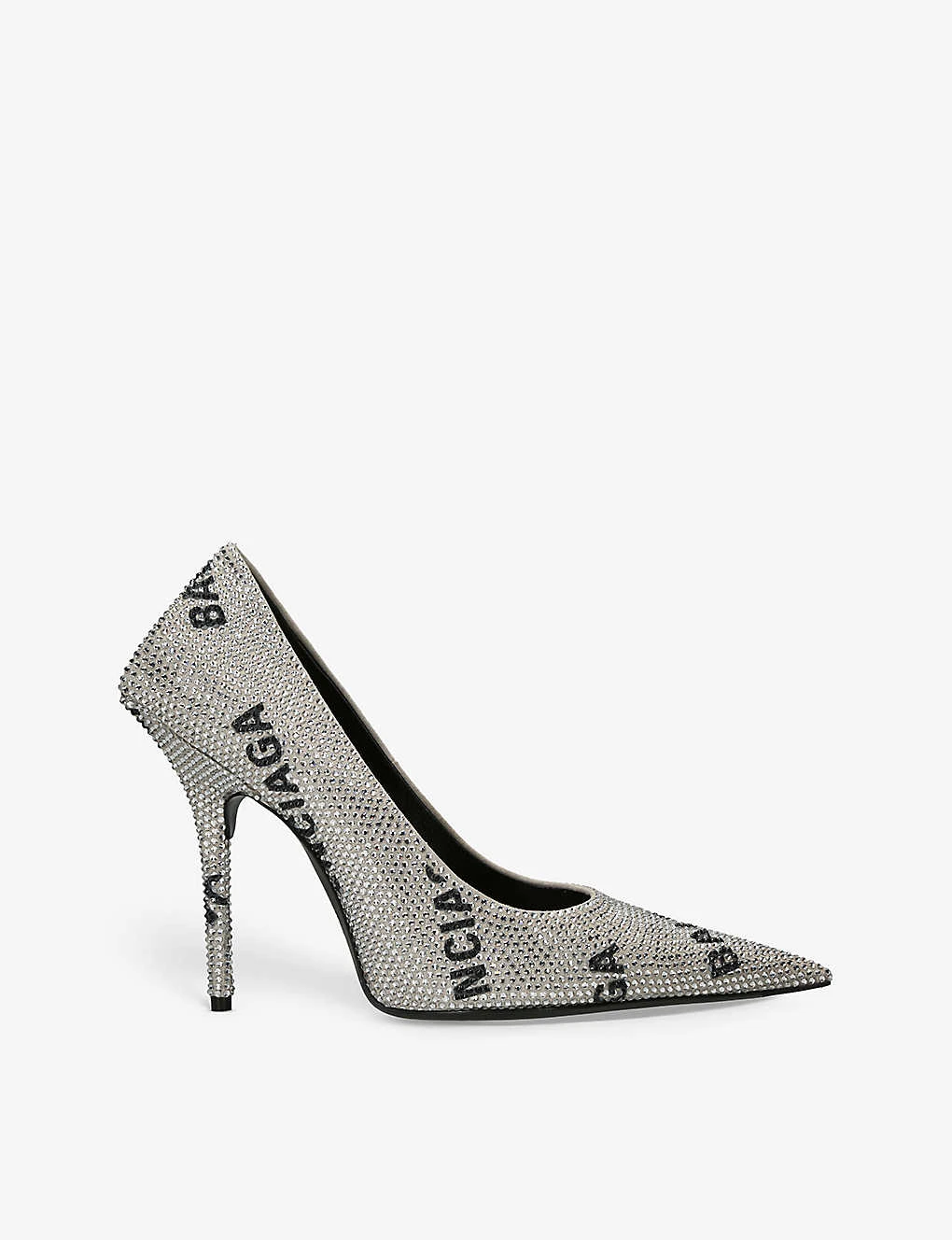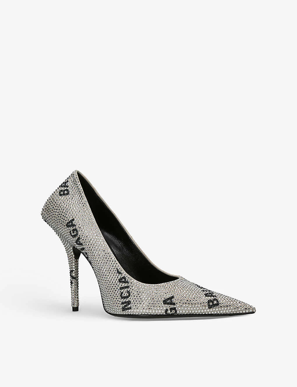 - Pointed toe, closed toe, stiletto heel, all-over rhinestone embellished, all-over logo print