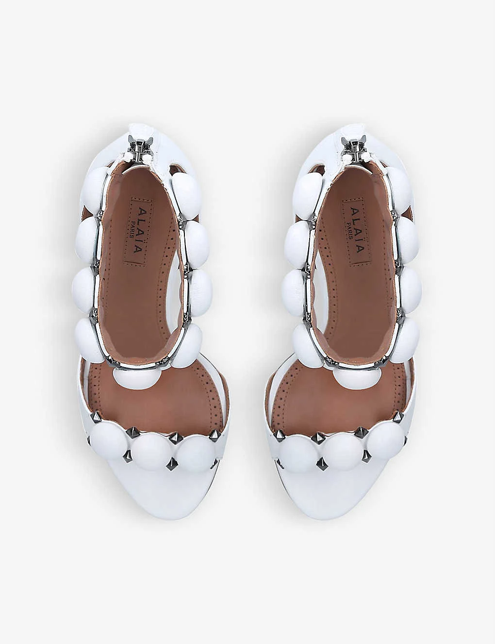 - Open almond toe, covered button embellishments, silver-tone spikes, ankle strap, logo embossed zip at back