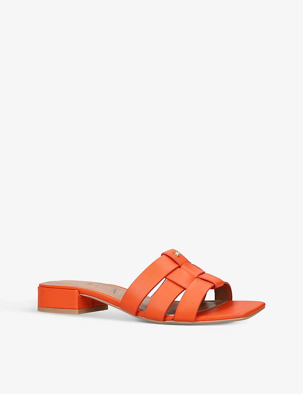 - Open square toe, interwoven toe straps, branded stud at toe, open back, low stacked heel