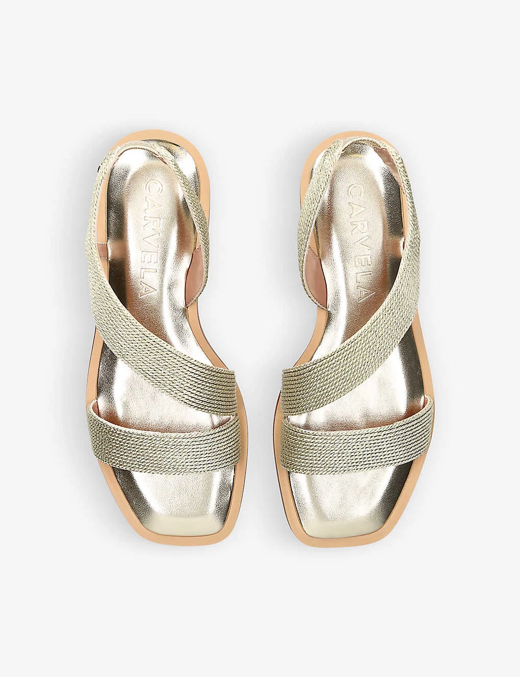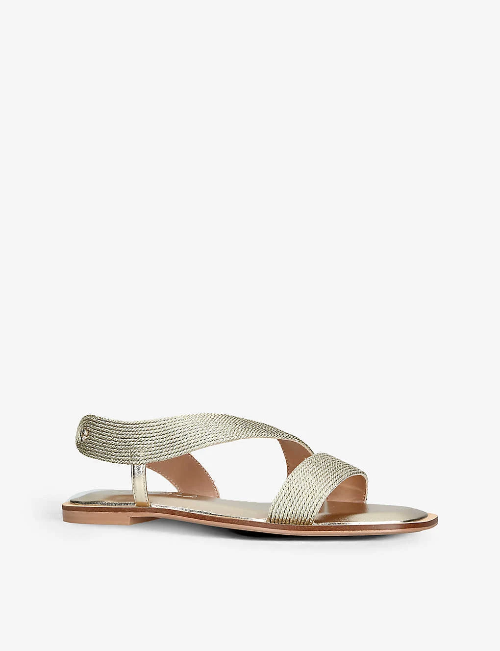 - Open square toe, asymmetric wide straps, rope effect, metallic finish, elasticated back strap