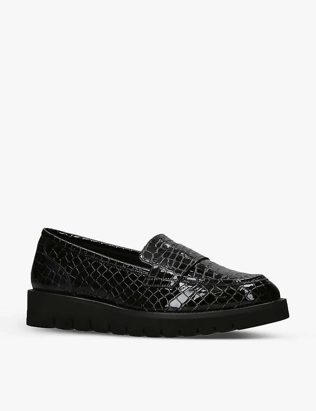 - Closed round toe, branded hardware at back, single strap at front, raised seam detail at front, tread finish sole, all-over patent finish, all-over croc embossed effect, gold-tone hardware