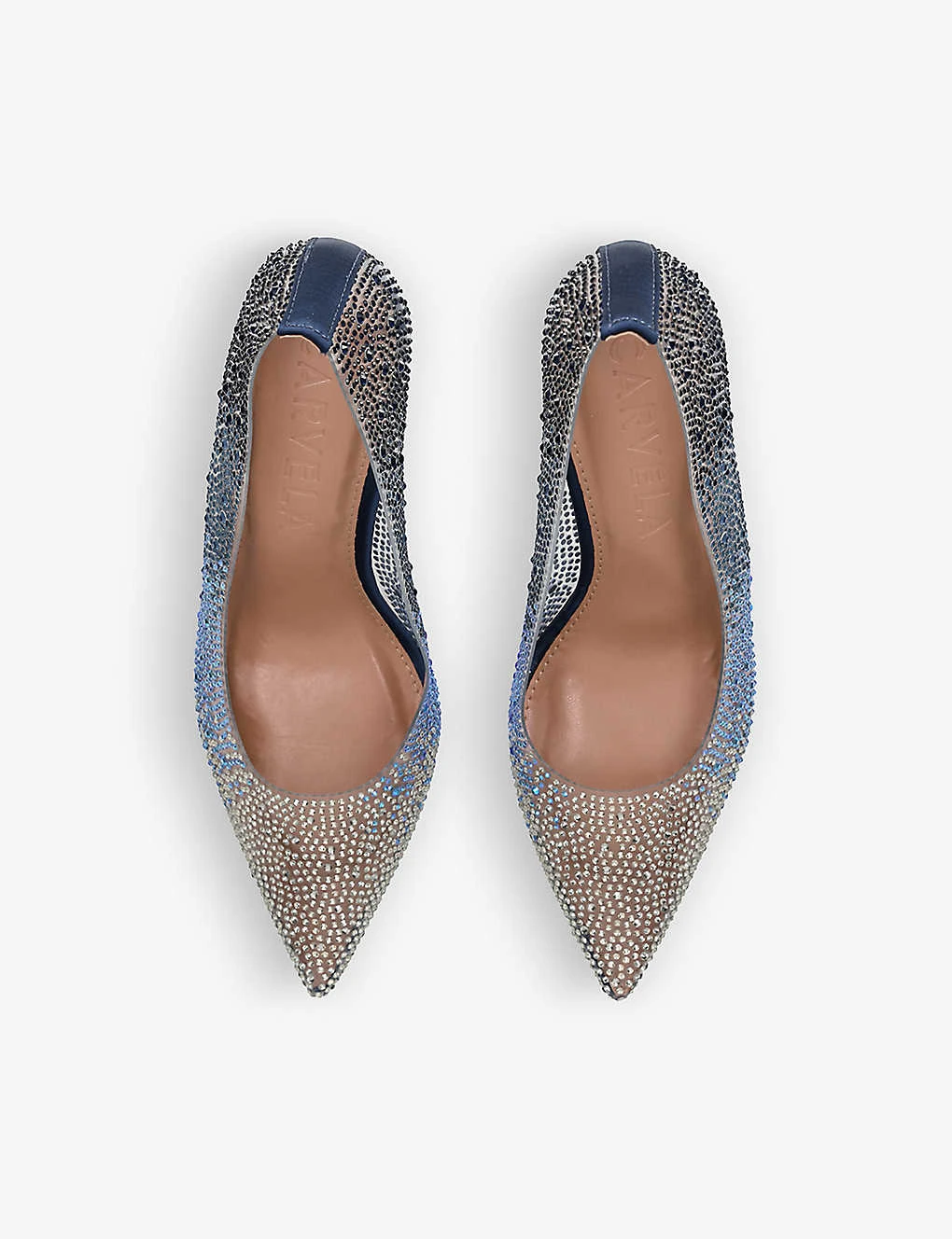 - Pointed toe, closed toe, tonal stitching, satin upper, crystal embellishment, stiletto heel
