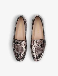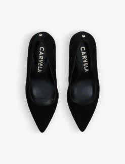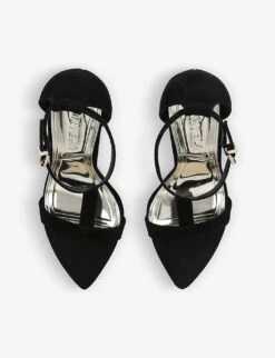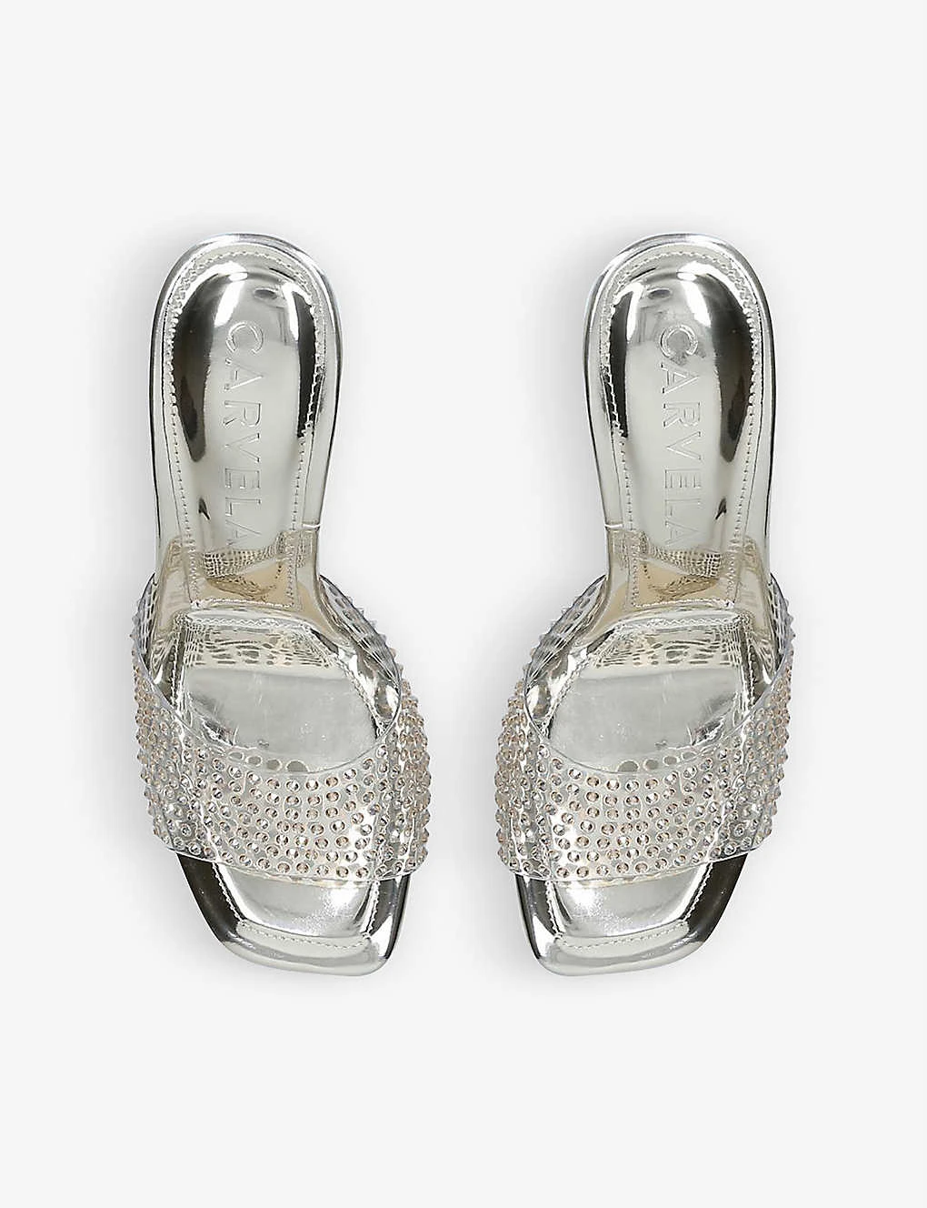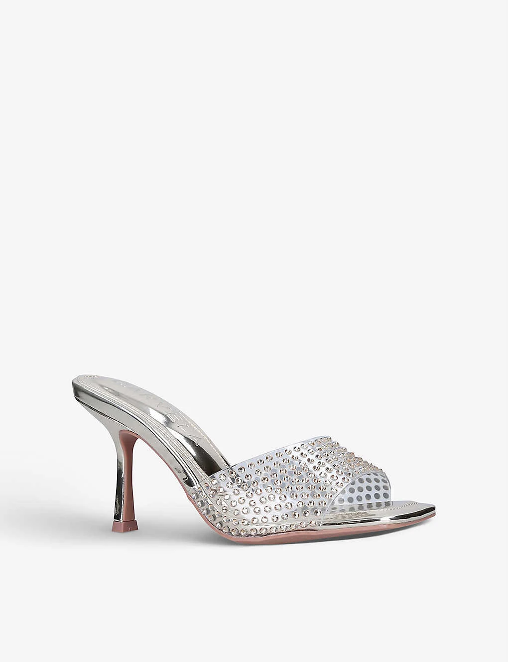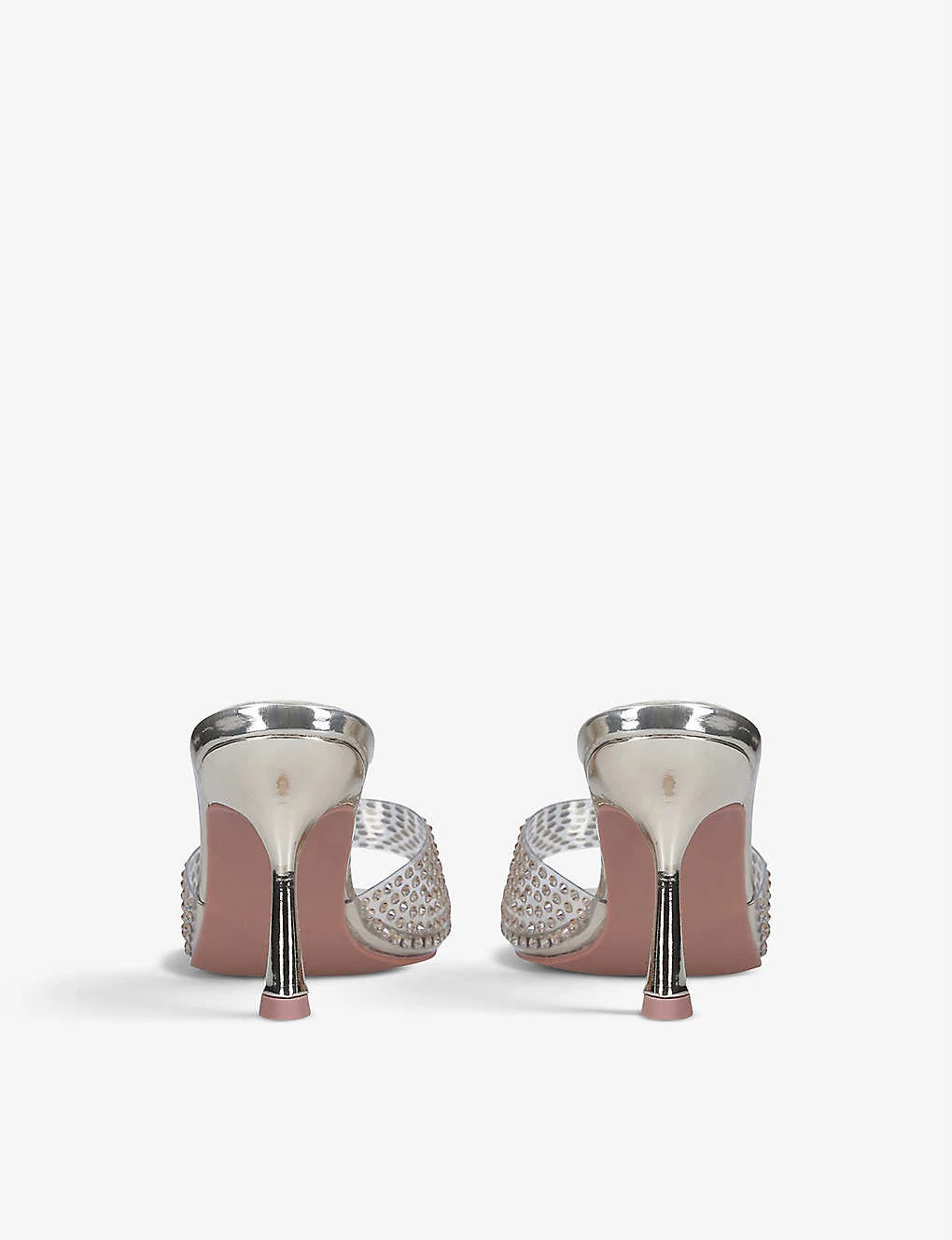 - Stiletto heel, gem-embossed exterior, square toe, metallic sole, logo-printed sole
