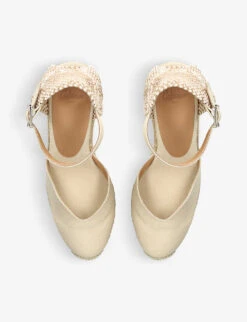 - Open round toe, adjustable ankle strap, cross strap at front, printed logo on footbed, all-over rope embellishment on heel, wedge heel