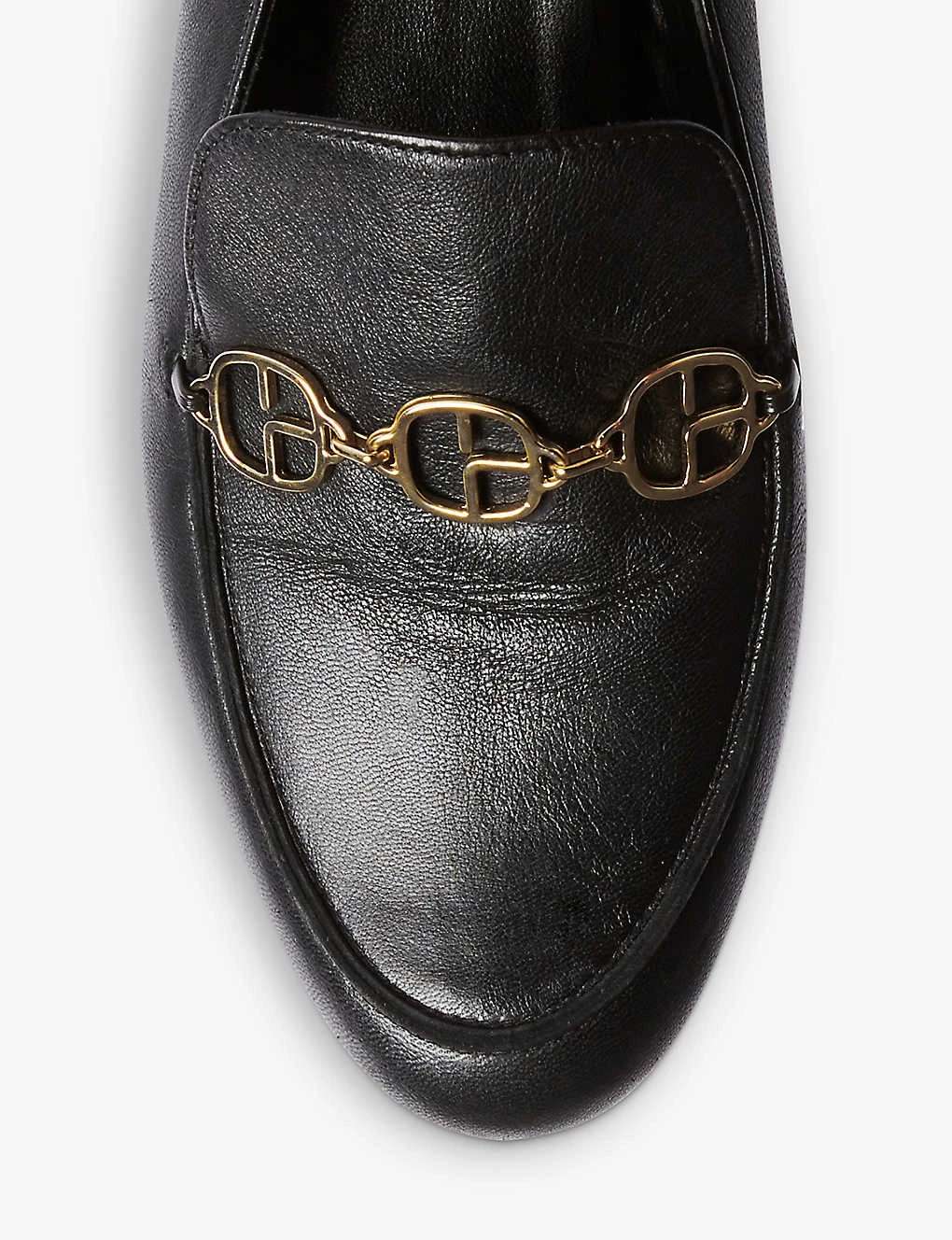 - Almond closed toe, apron toe, front chain trim, gold-tone hardware
