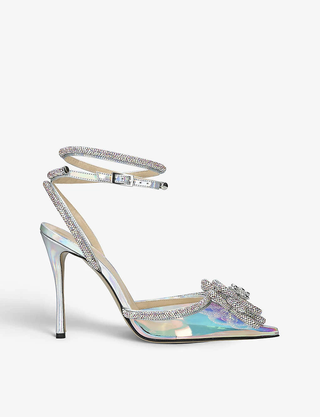 - Closed pointed toe, wraparound straps, stiletto heel, crystal-embellished flower embellishment, silver-tone hardware