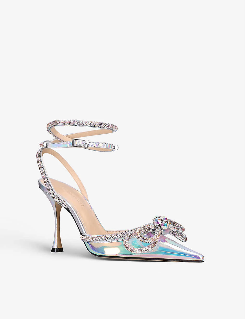 - Clear pointed toe, crystal-embellished bow, wraparound straps, stiletto heel