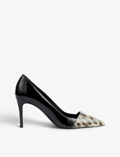 - Pointed closed toe, leopard-print at front panel, stiletto heel, patent finish