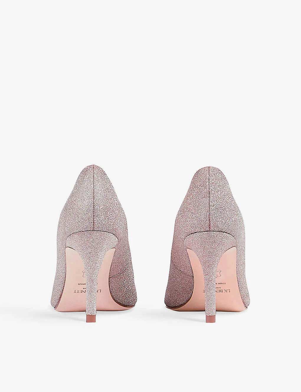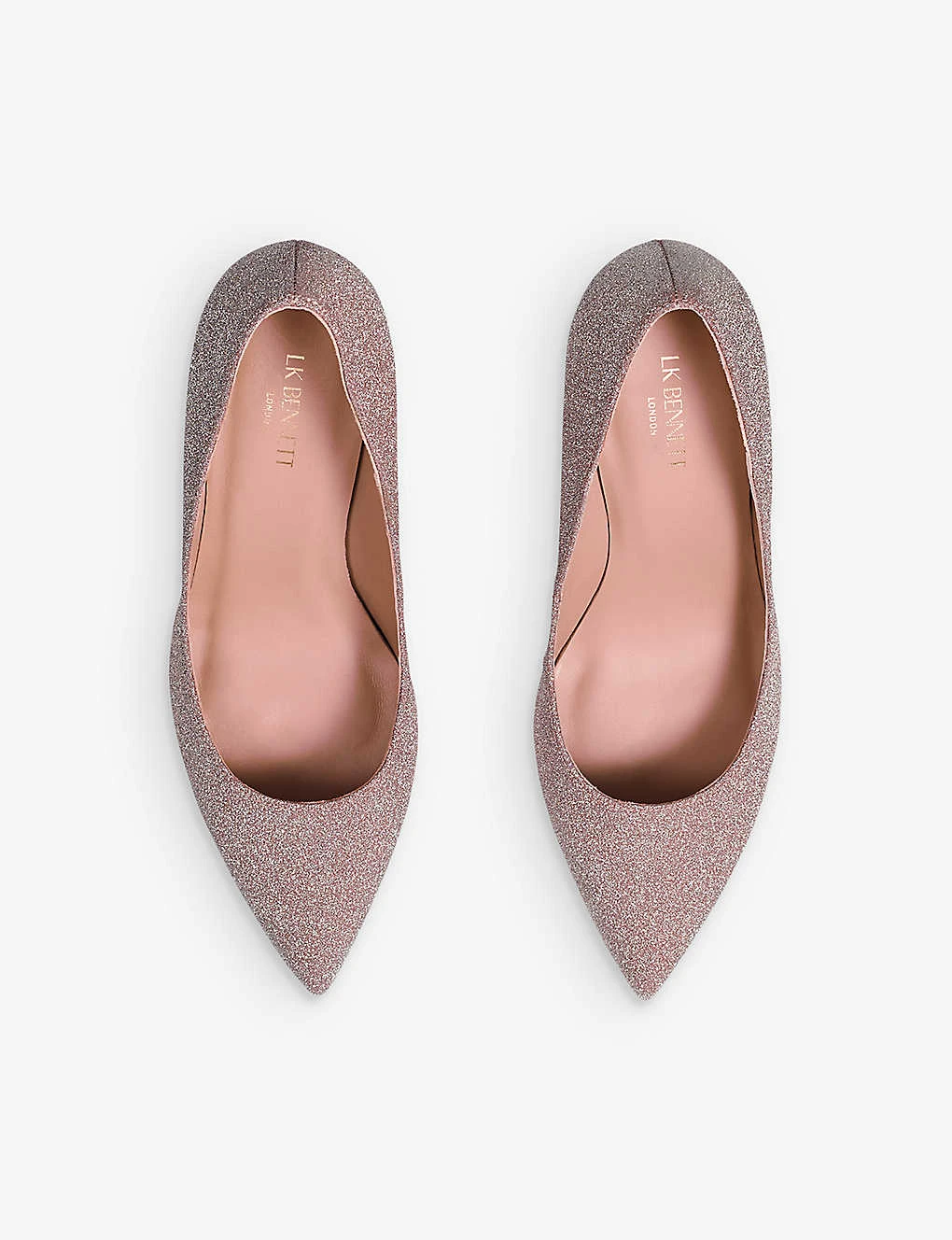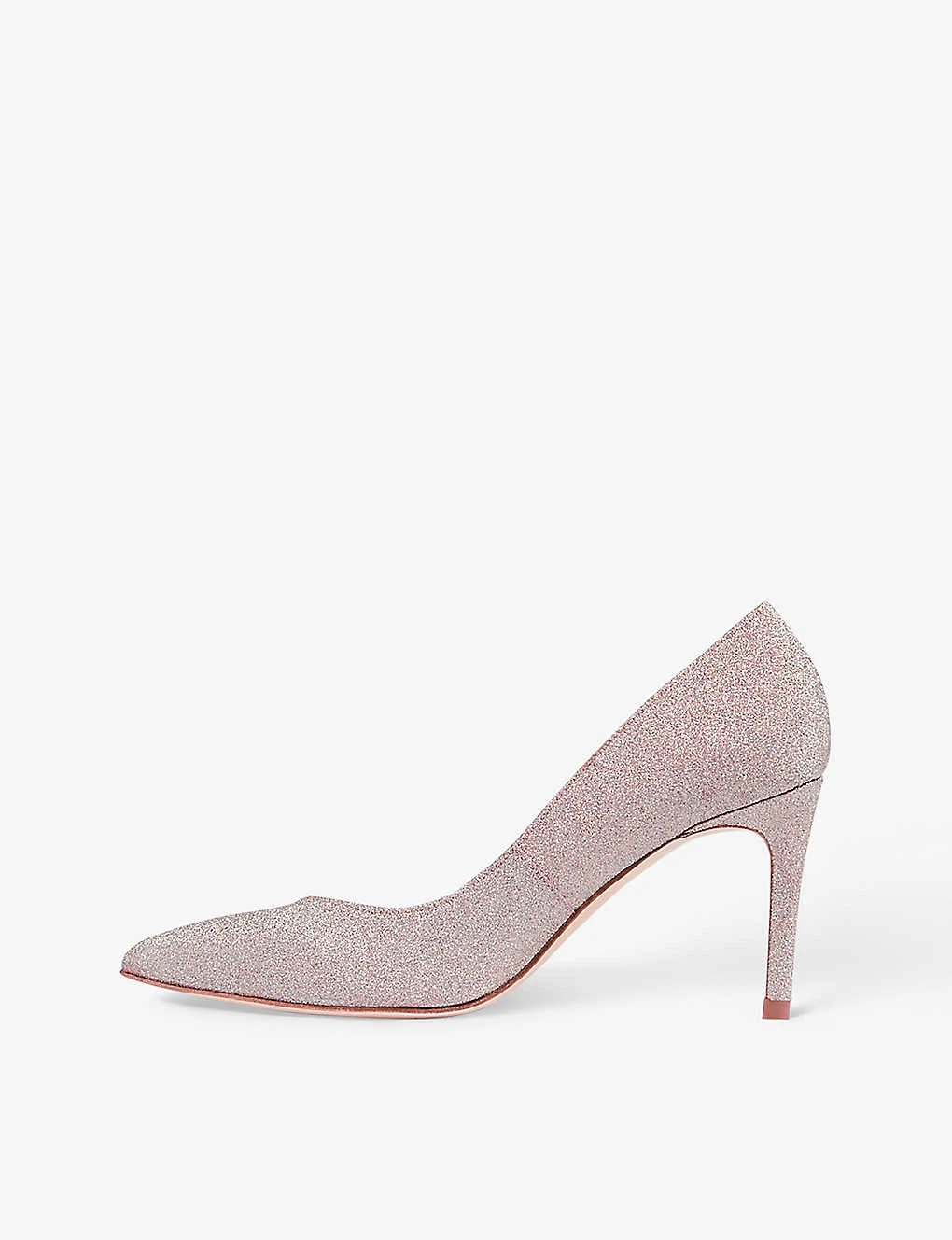 - Pointed toe, closed toe, stiletto heel, all-over glitter