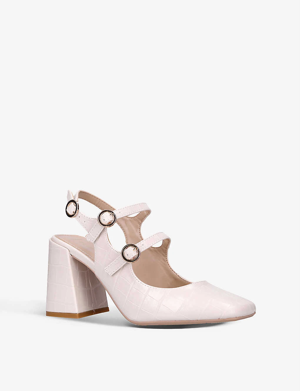 - Square toe, closed toe, block heel, buckle-fastened straps across the upper