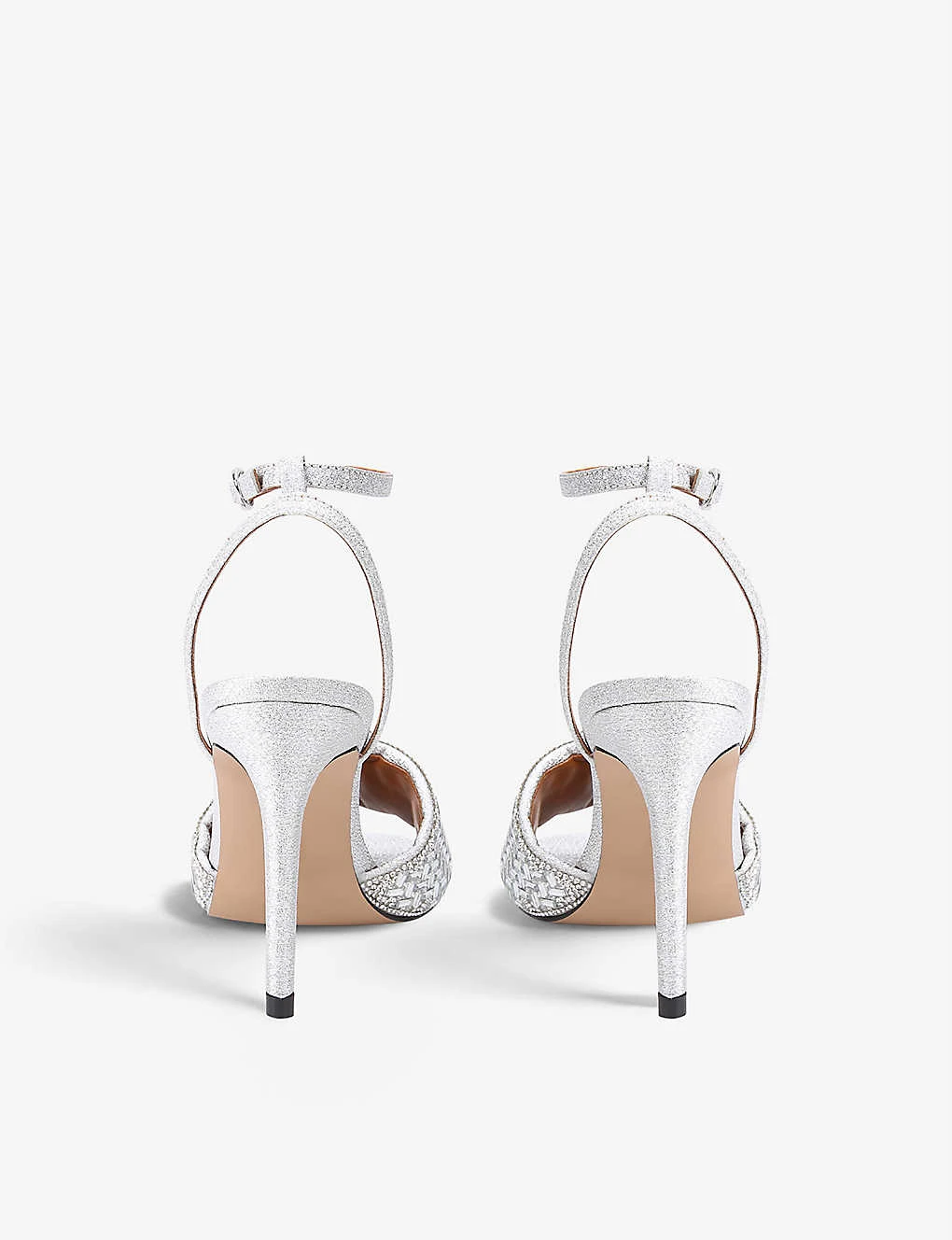 - Almond toe, stiletto heels, all-over metallic fabric, crystal-embellished silver eagle head on buckle fastening, quilted crystal strap