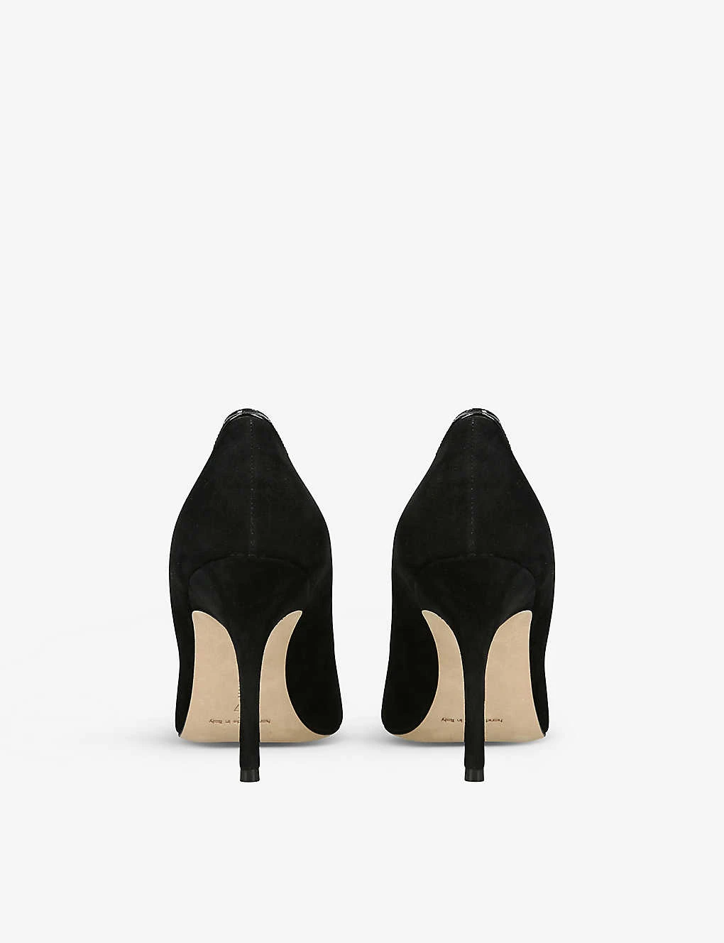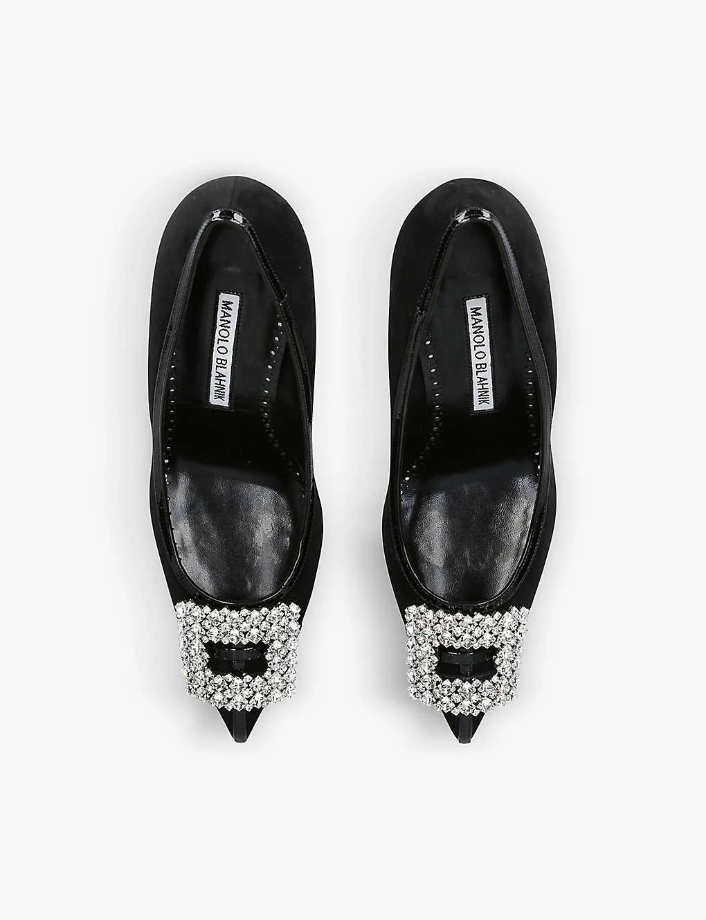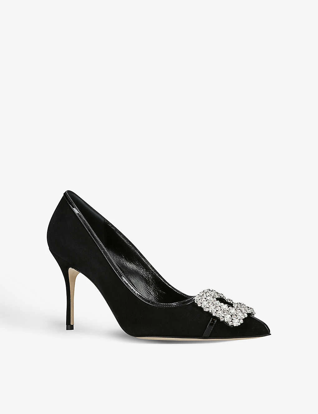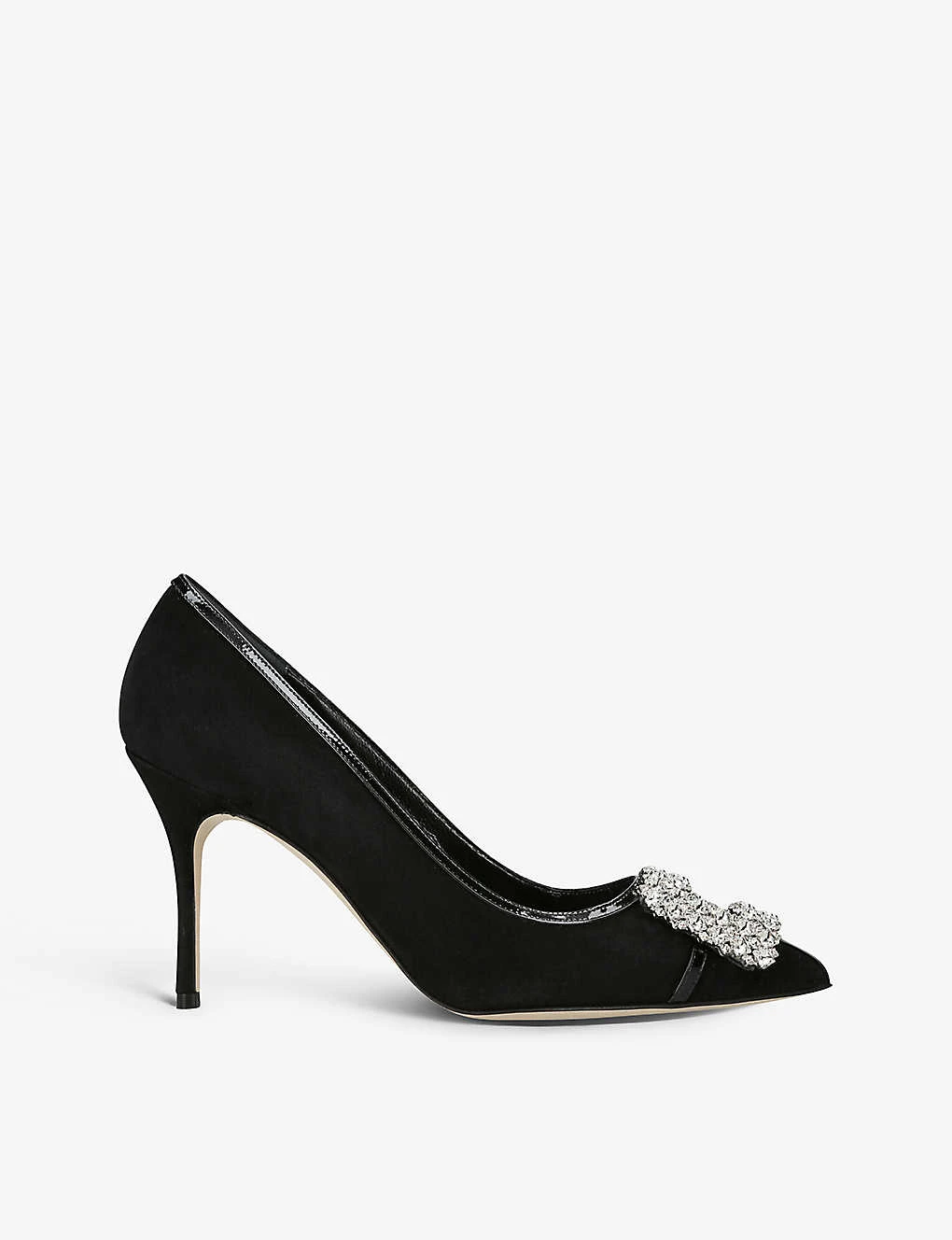 - Closed toe, pointed toe, buckle embellishment at front, stiletto heel, patent trims, silver-tone hardware