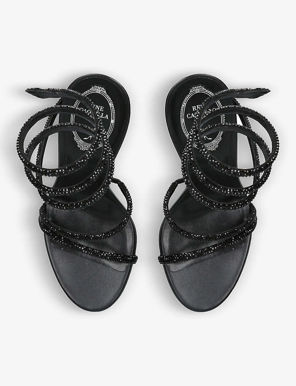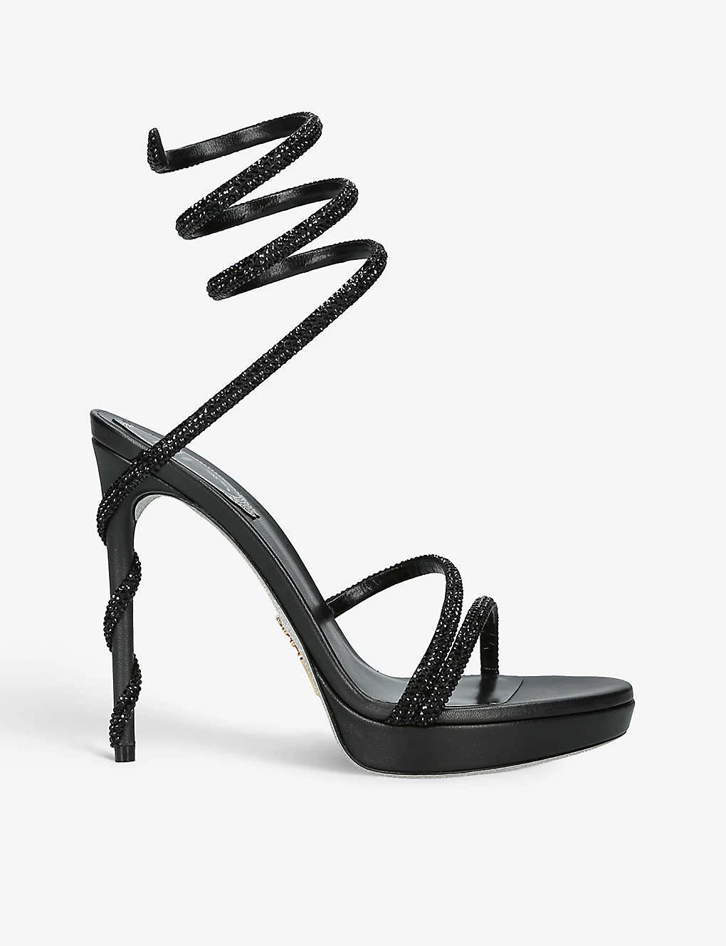 - Round toe, asymmetrical toe bands, all-over crystal-embellished snake wrapped around the front and heel, platform sole, stiletto heel, handmade