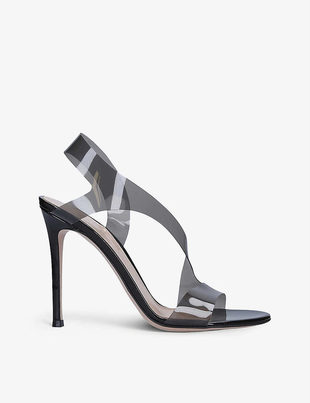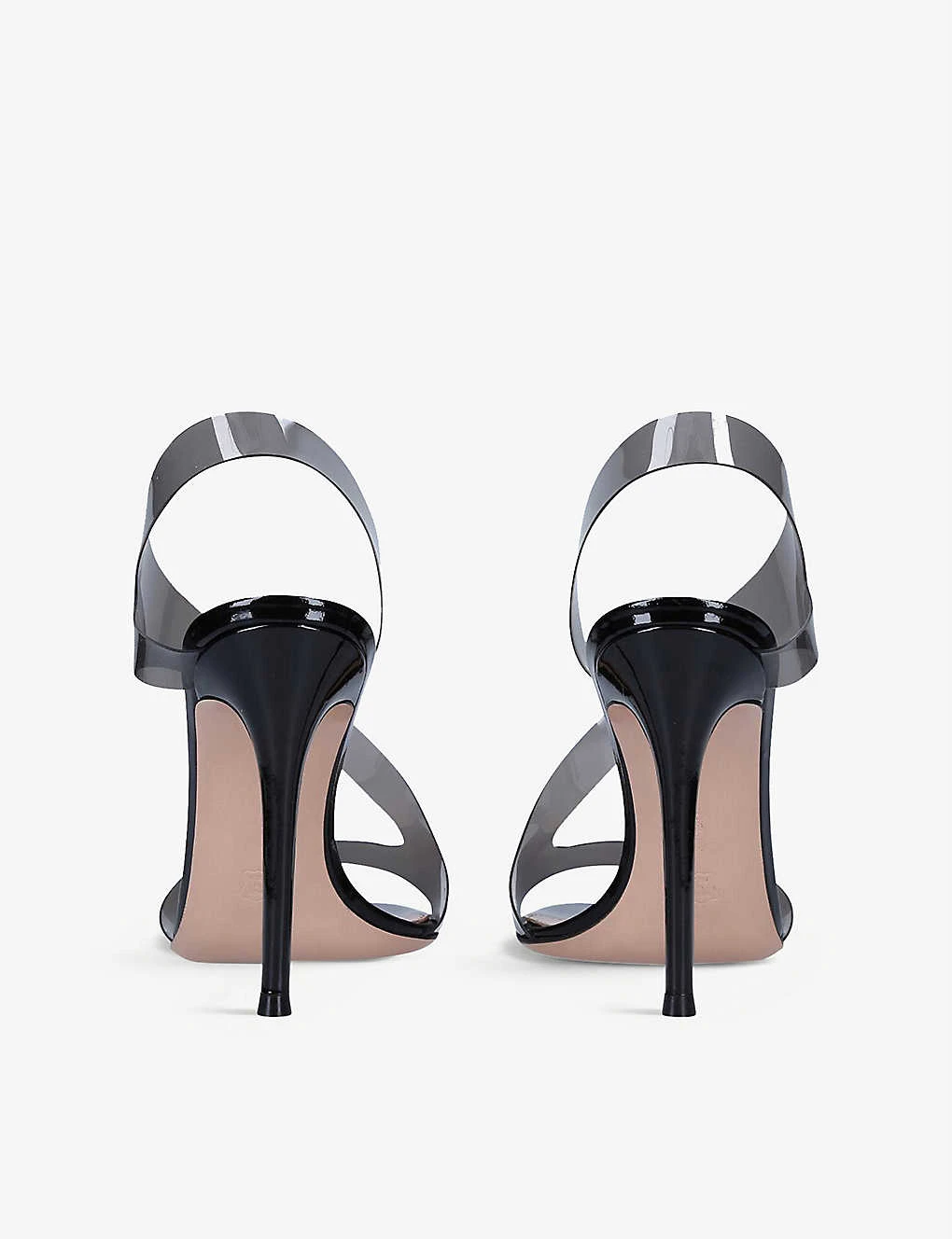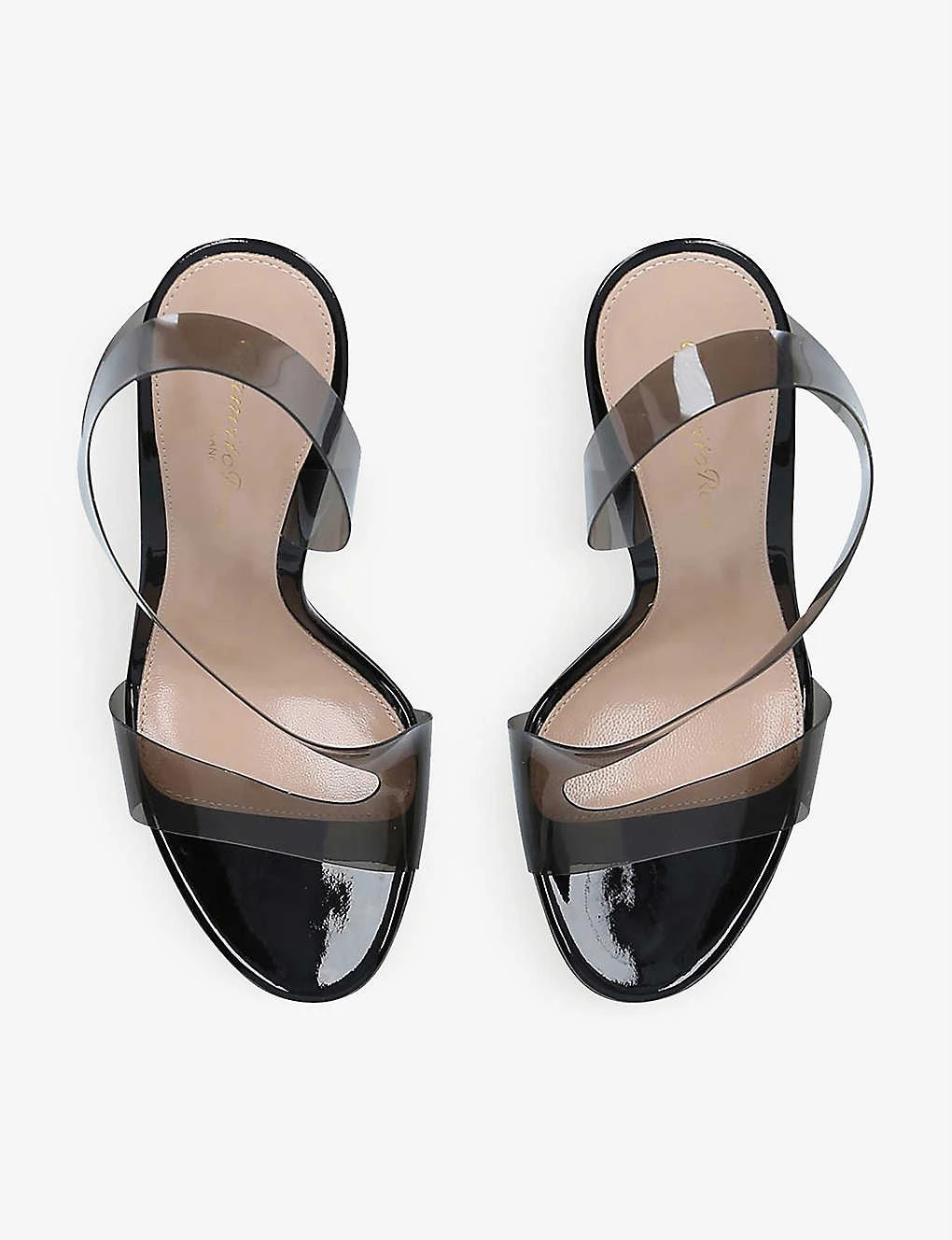 - Open toe, round toe, transparent strap detailing, branded insole, stiletto heel