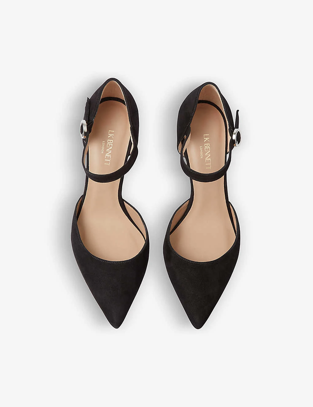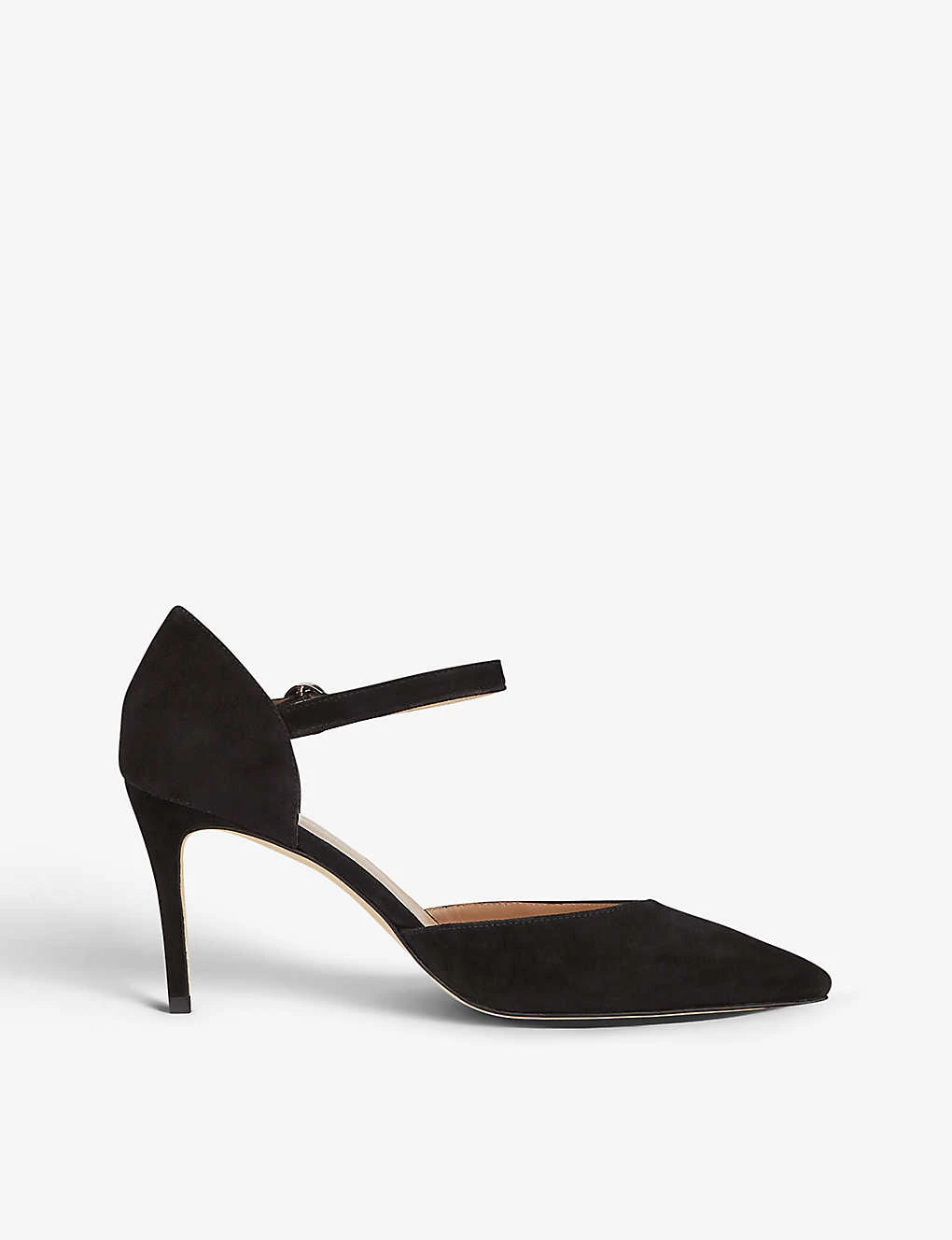 - Pointed closed toe, closed back, adjustable ankle strap, logo print on footbed, stiletto heel