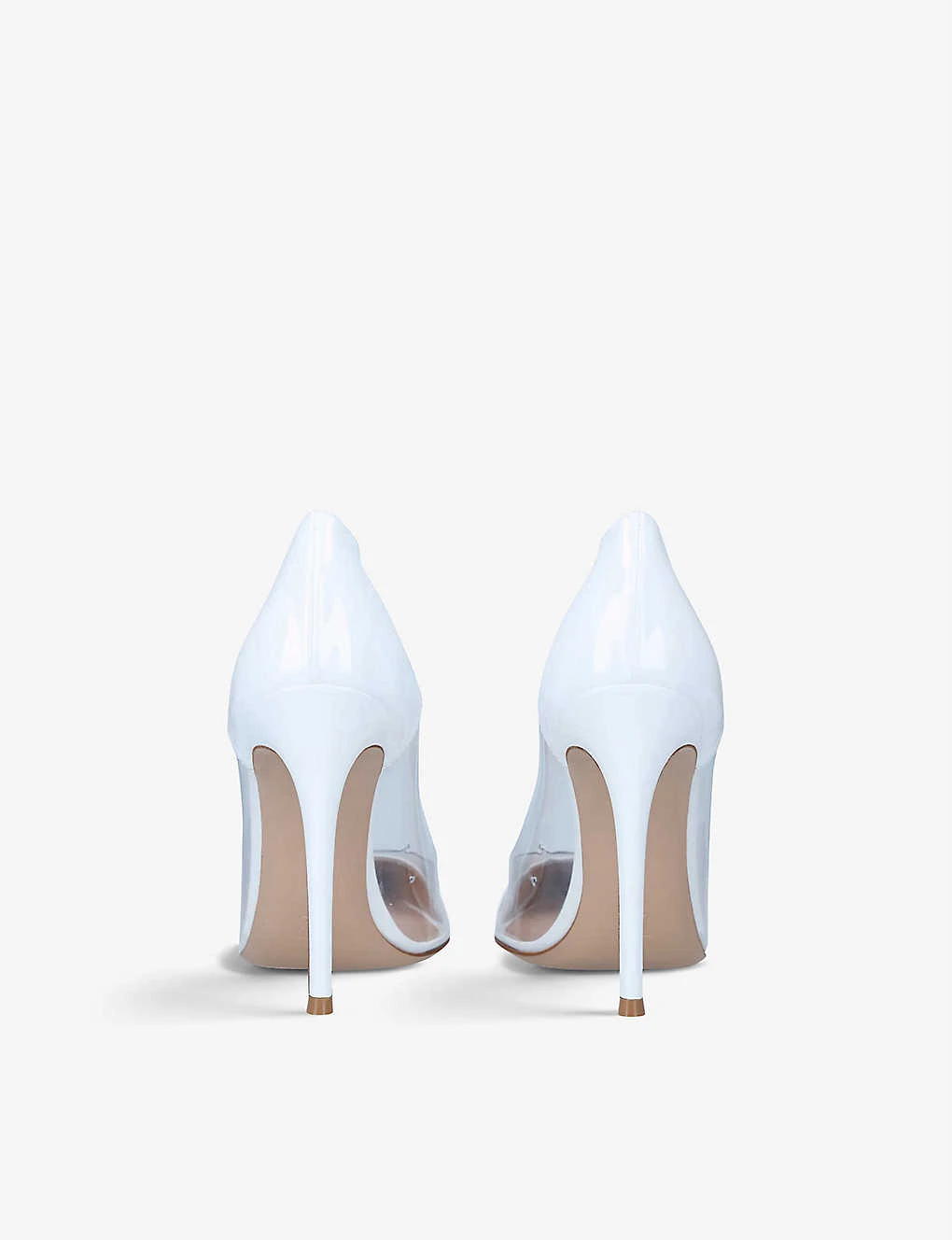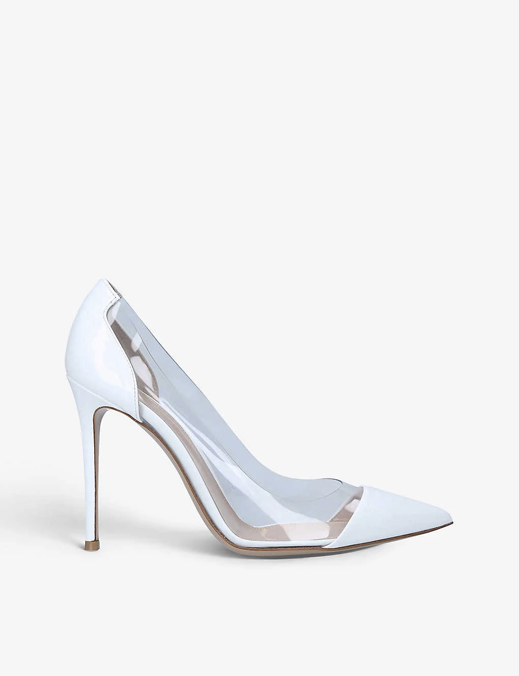 - Pointed toe, transparent side panels, covered stiletto heel, closed toe, patent finish