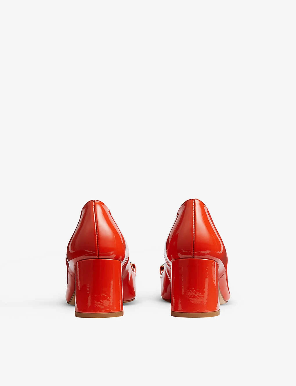 - Square toe, closed toe, mini gold-tone snaffle at front, block heel, embossed logo at footbed
