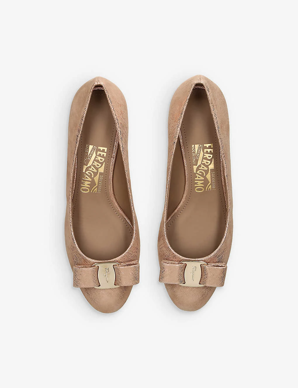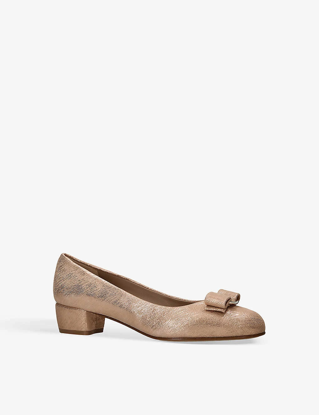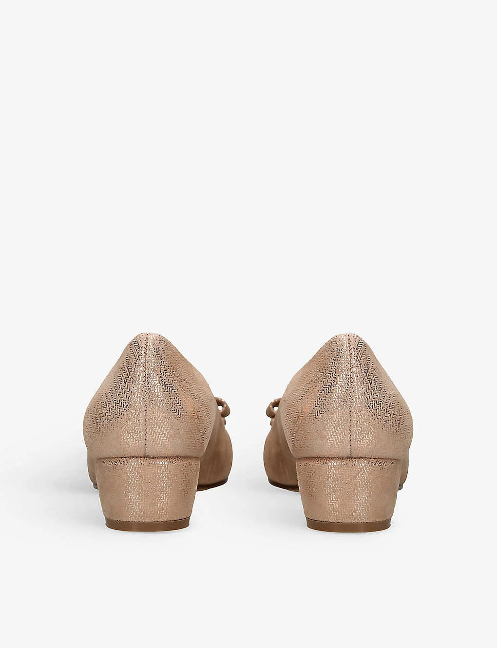 - Round toe, bow to the front, gold-toned metal plaque, engraved branding, covered block heel, all-over metallic pattern