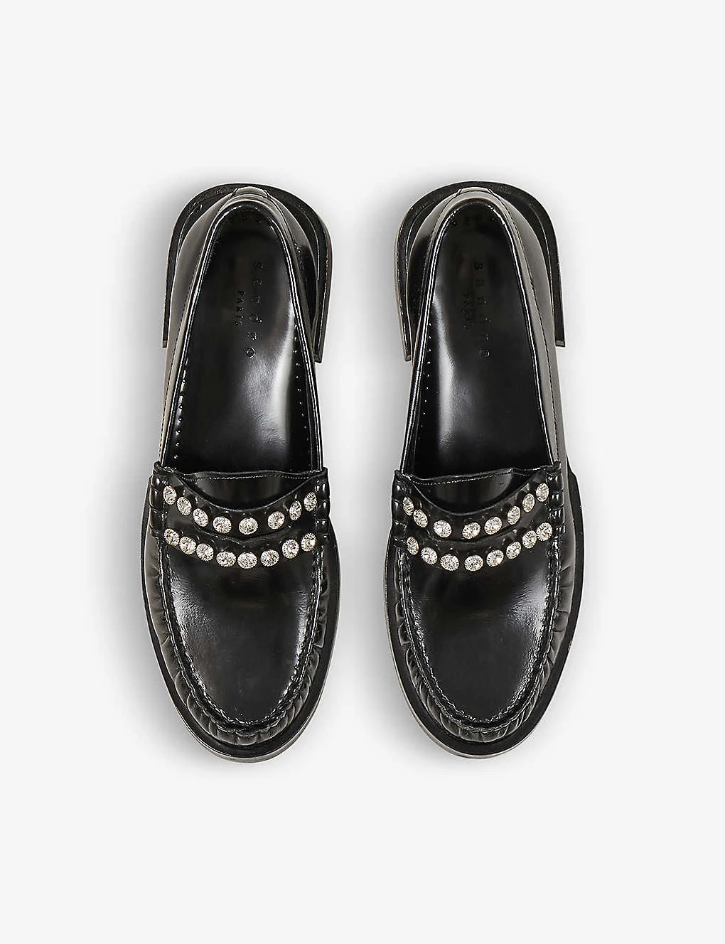 - Round toe, piped trims, rhinestone embellishments across the vamp, notched sole