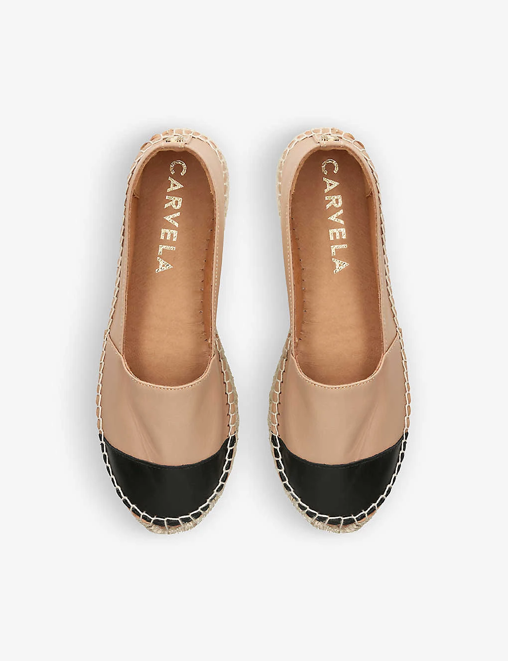- Round closed toe, panelled design, contrasting toe panel, woven espadrille sole, logo plaque at heel