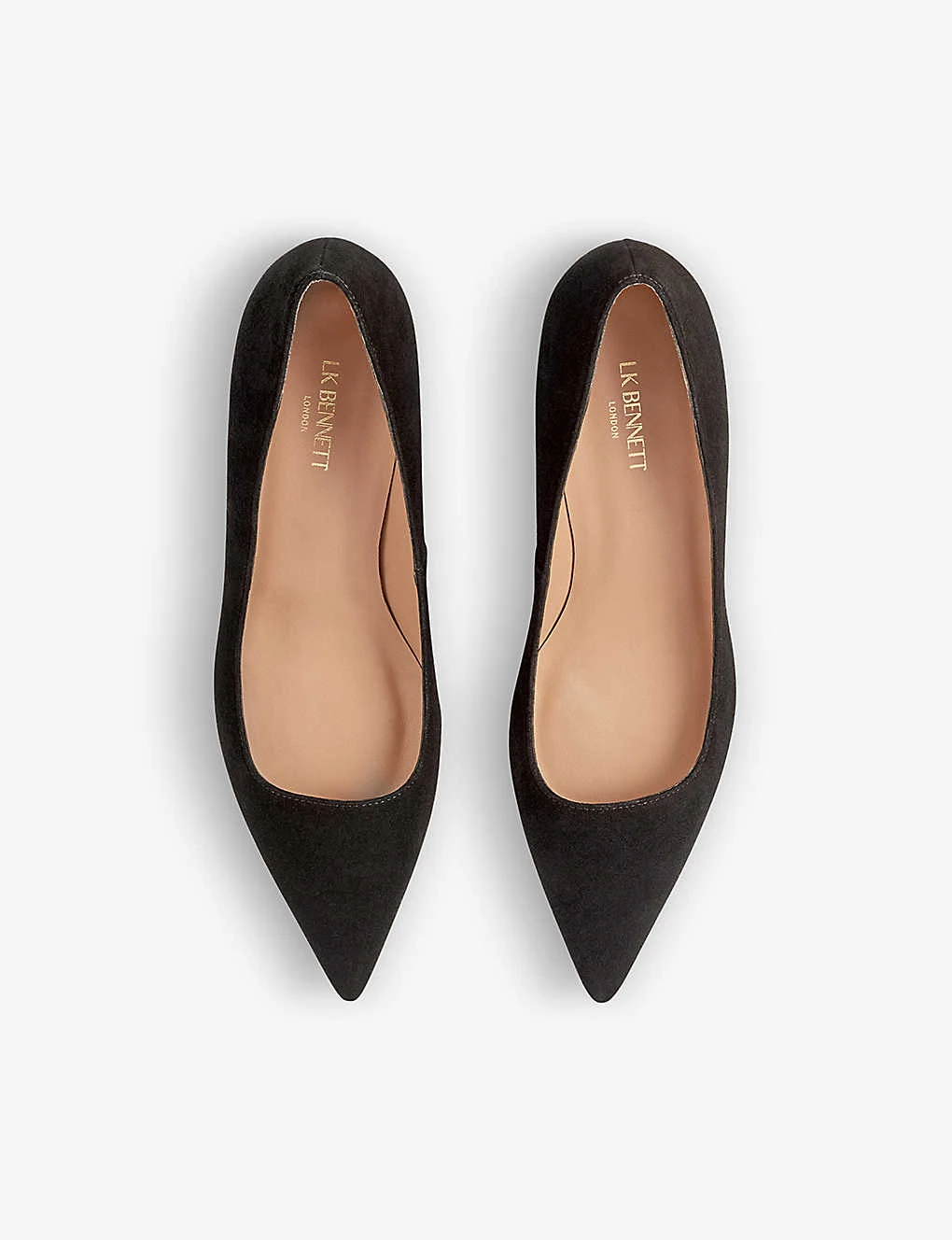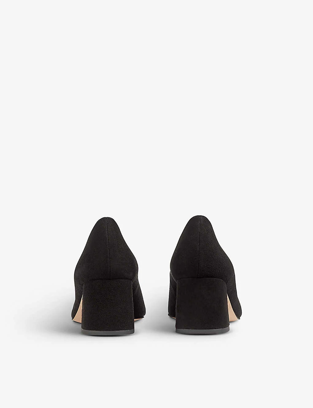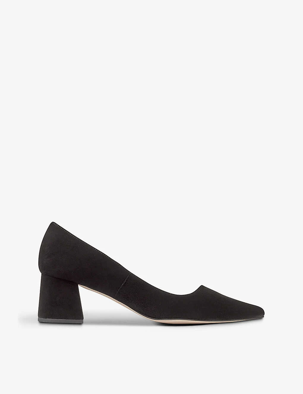 - Close pointed toe, printed logo on footbed, all-over tonal stitching, block heel