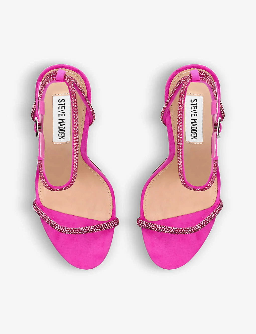 - Open toe, rhinestone-embellished straps, criss-cross back