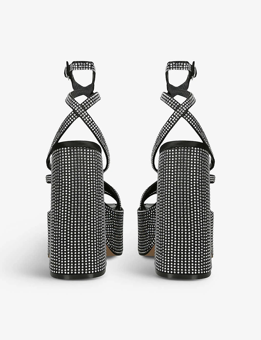 - Round open toe, asymmetric strappy construction, all-over crystal embellishments, block heel, platform sole