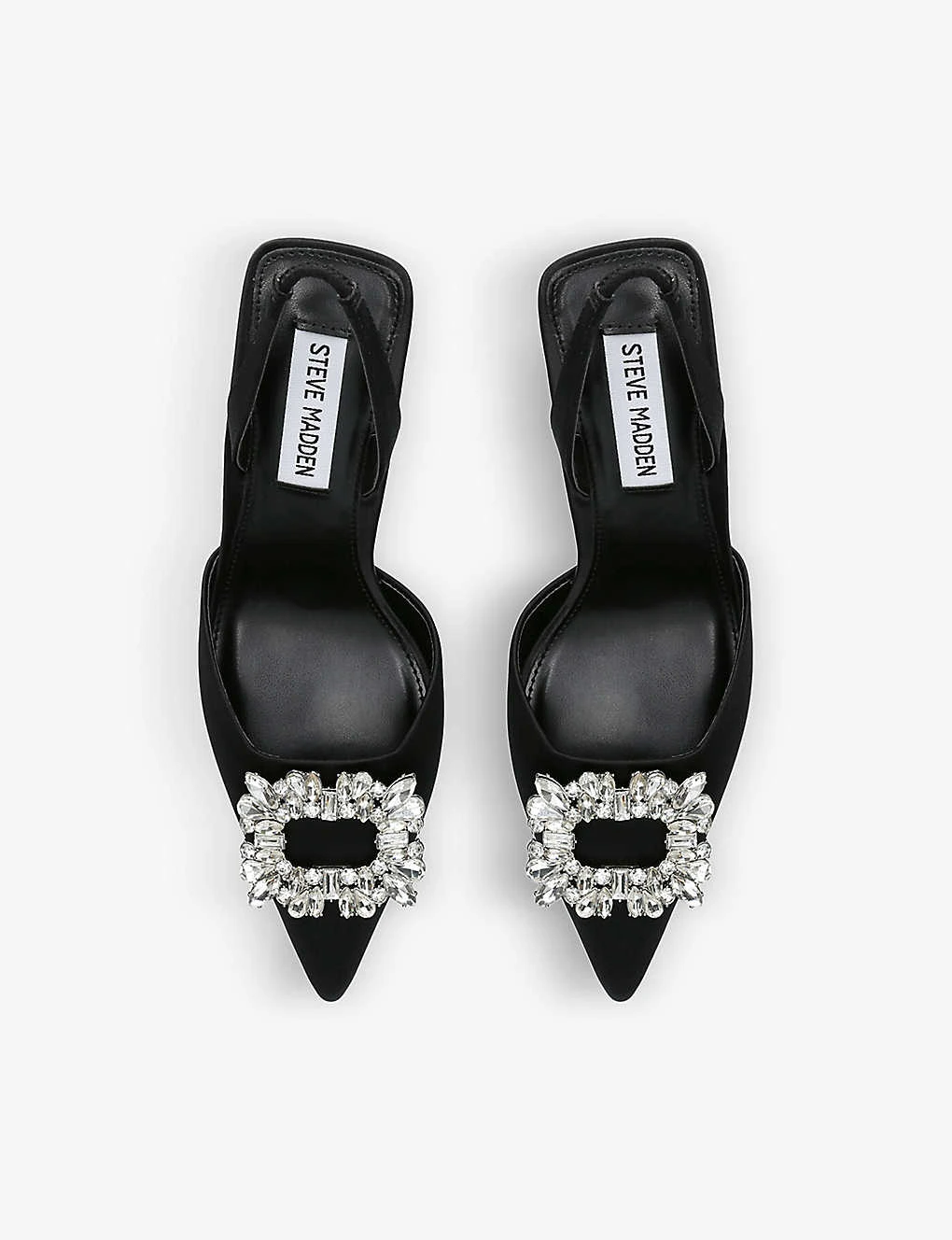 - Pointed toe, elasticated ankle strap, jewel-embellished square at foot, flared heel