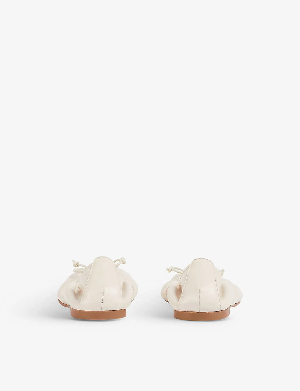 - Square toe, closed toe, all-over crinkled leather texture, metallic finish, elasticated trim, bow-embellished, branded insole