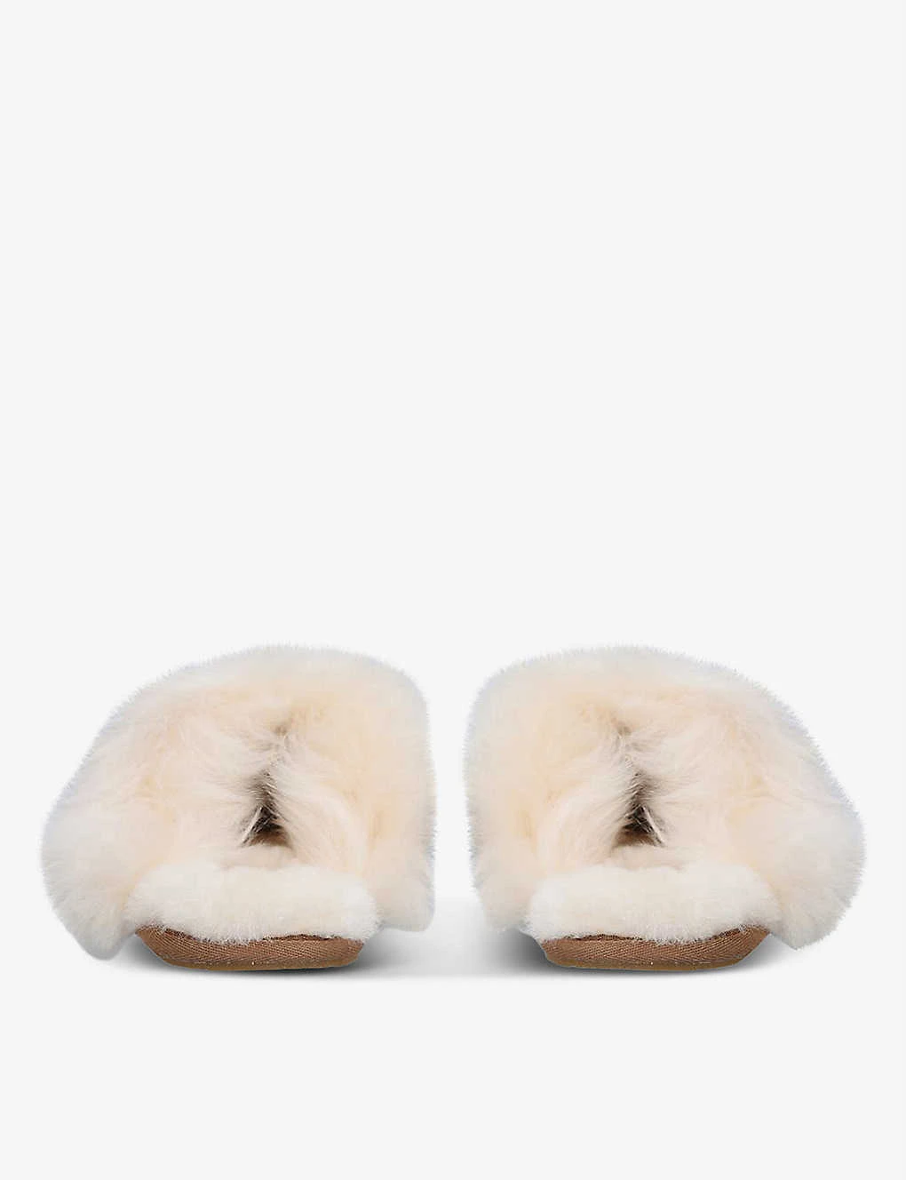 - Round toe, closed toe, open back, fur lining and brim across the front, branded tab, flat sole