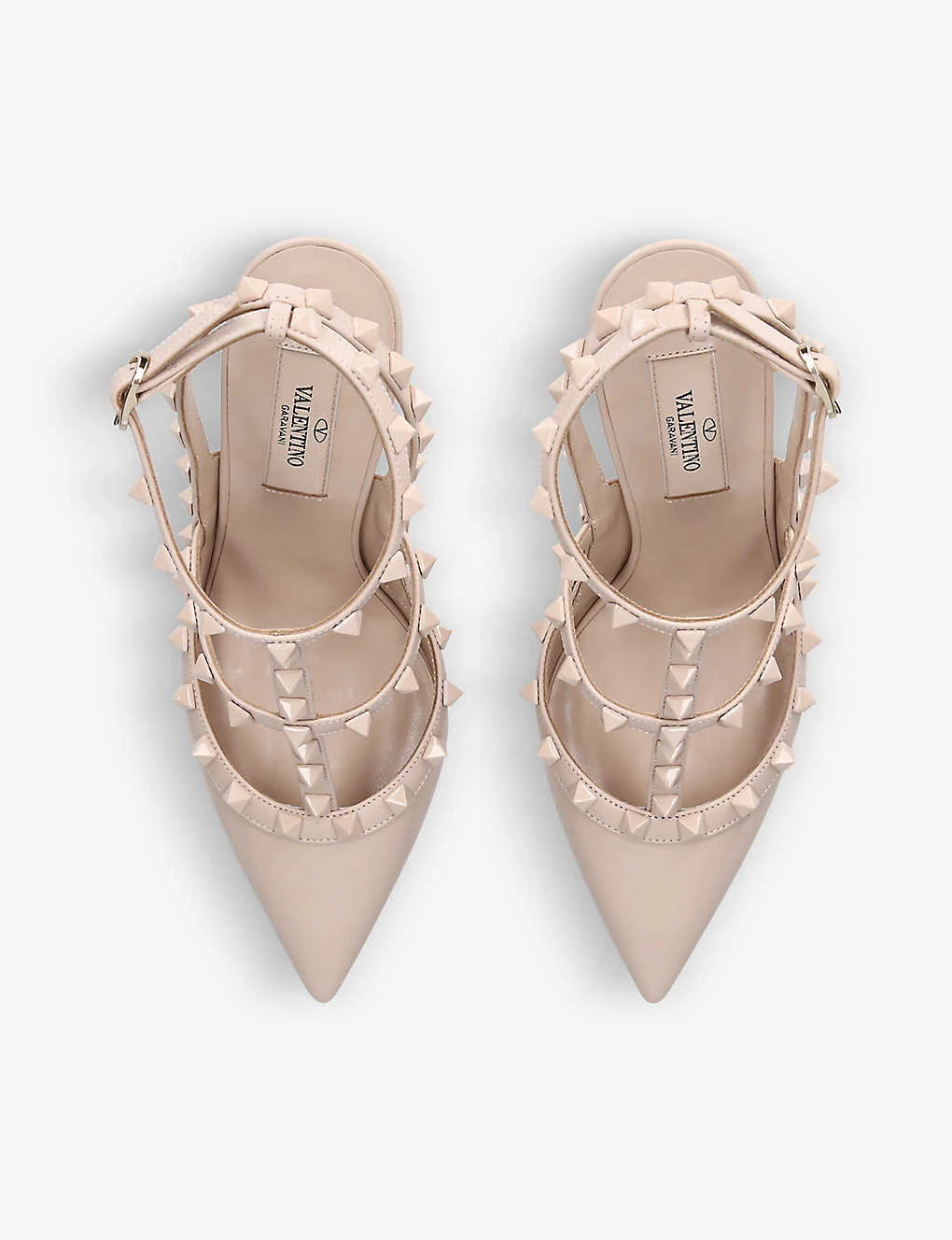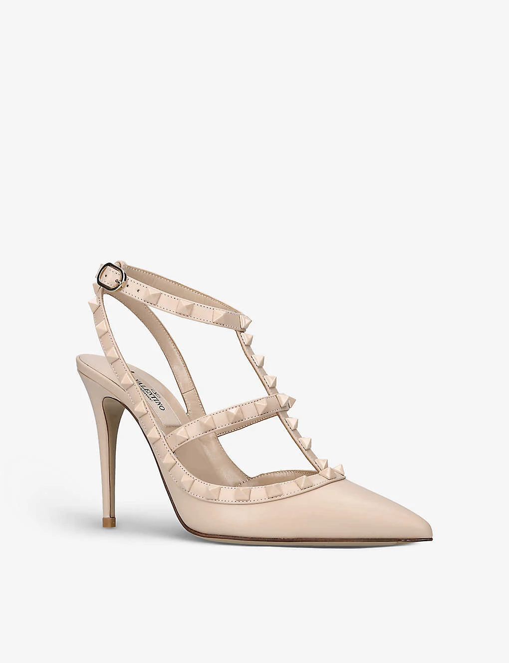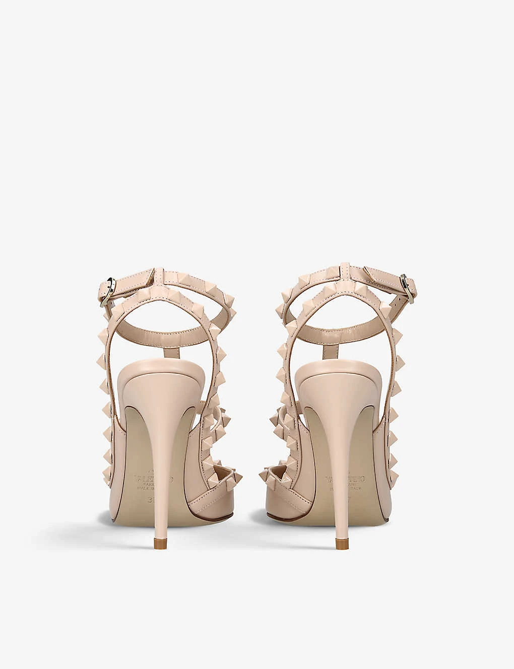 - Closed toe, pointed toe, caged strap design, Rockstud embellishments at straps, stiletto heel, tonal hardware