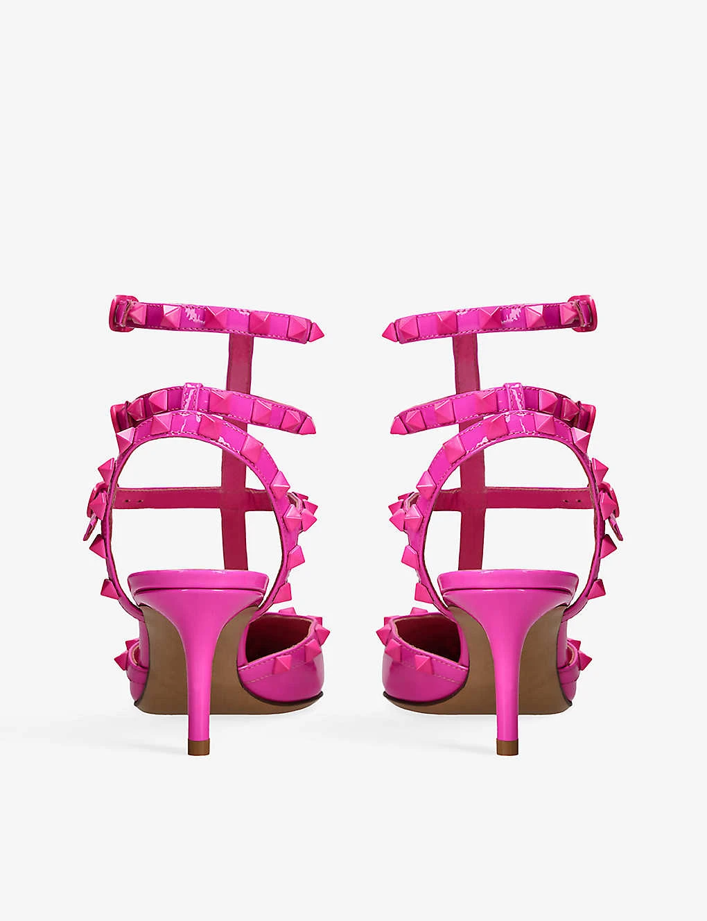 - Closed pointed toe, stud embellished, backless, multi straps, stiletto heel
