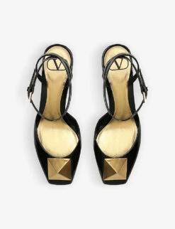 - Brand design plaque at buckle, oval toe, platform and block-heel, all over patent leather, gold-toned hardware