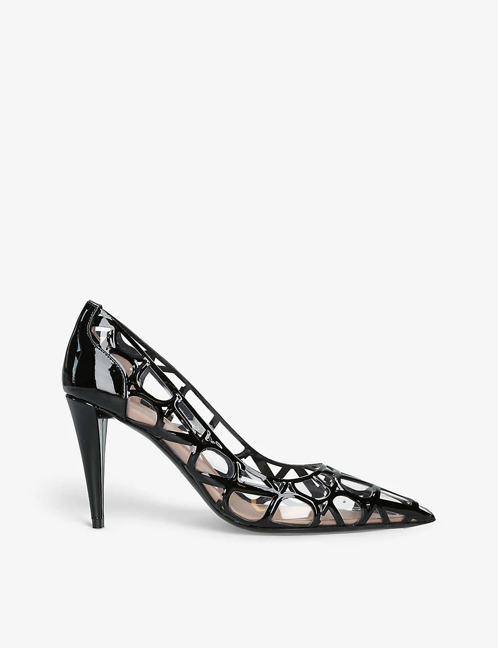 - Closed toe, pointed toe, stiletto heel, all-over logo-embossed, translucent panels