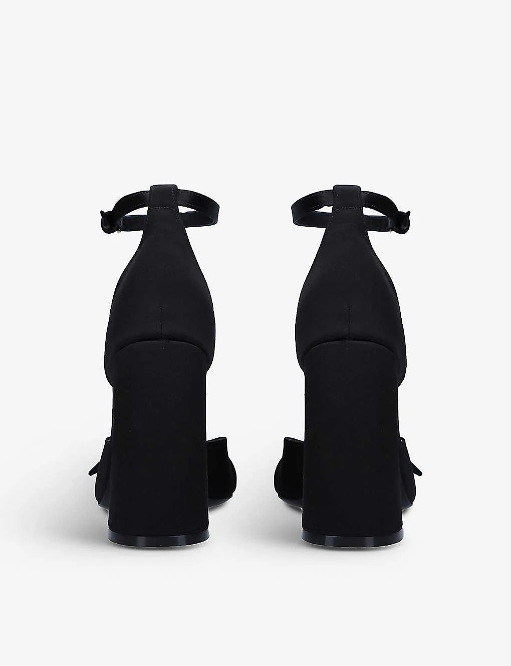 - Square toe, open toe, curved heel, ankle-buckle design, crystal-embellished logo plaque at front