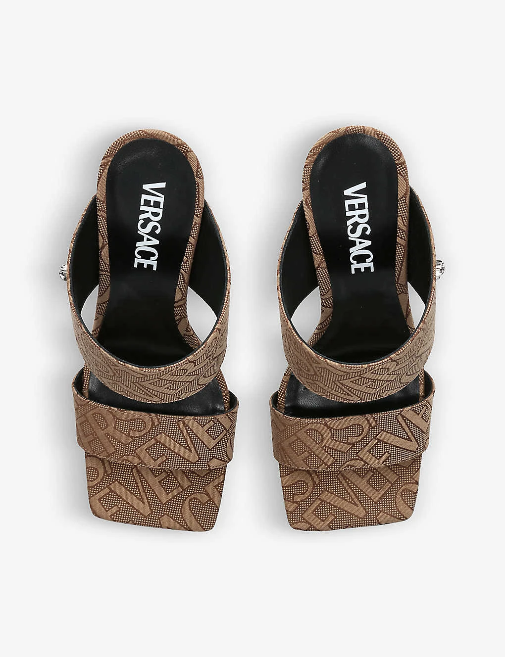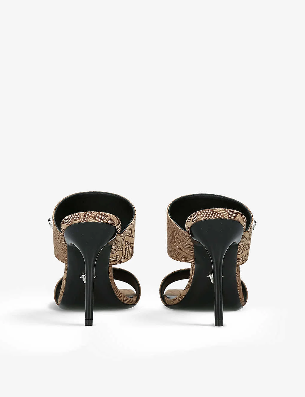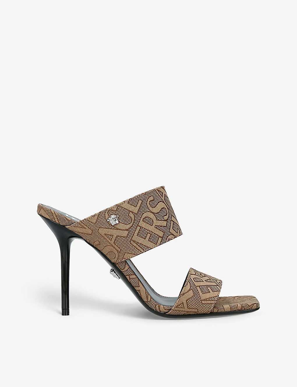 - Open square toe, two straps, canvas-texture upper, all-over logo print, silver-tone Medusa Head embellishment, stiletto heel